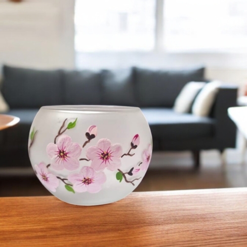 Medium Frosted Glass Candle Holder, Hand Crafted in Ukraine, Cherry Blossom Design, Wonderful Year Round