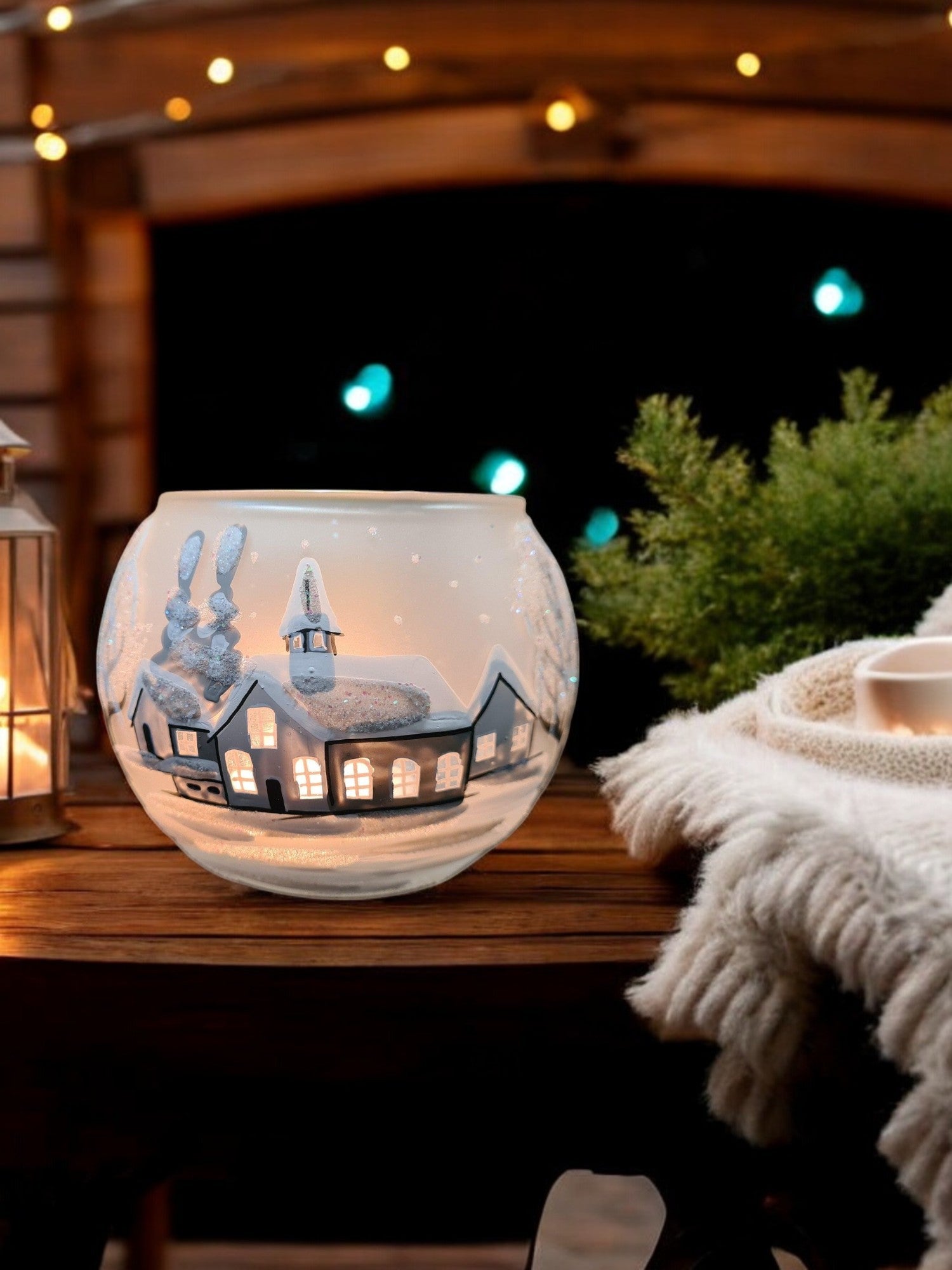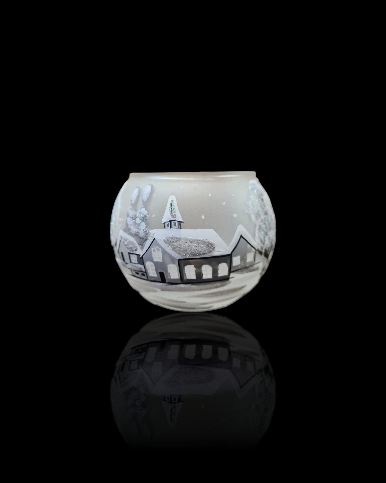 Medium Frosted Glass Candle Holder, Hand Crafted in Ukraine, White Church Winter Wonderland, Wonderful Year Round