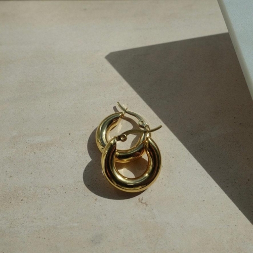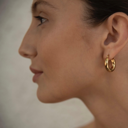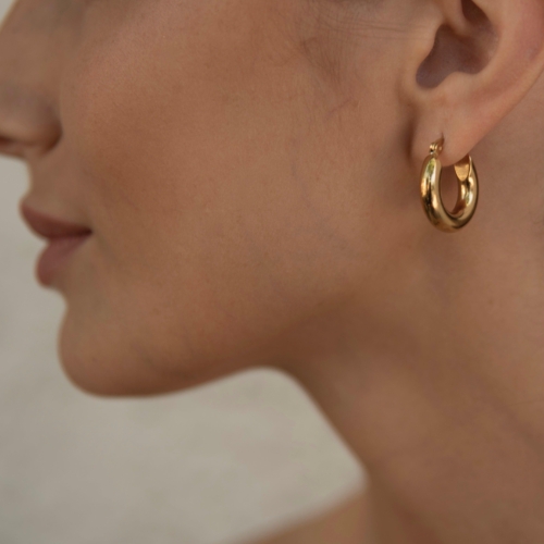 Chunky gold hoops earrings, a timeless classic. These gold hoops can be worn with absolutely anything and they are an elegant way to dress up effortlessly. The hoops are thick yet comfortable to wear every day. Size External hoop circumference: 2cm/0.8″. Hoop width: 5mm. Weight: 22g. Composition 18K gold layer over stainless steel base. Hypoallergenic, tarnish-free & waterproof jewellery. We found the perfect formula to create gold plated jewellery that is durable, doesn’t discolour and looks just as good as fine jewellery. We use PVD technique for the gold coating over a stainless steel base. Our pieces are coated in a thicker gold plating than the industry standard for anti-tarnish, waterproof and long lasting wear. Due to the hypoallergenic properties of the stainless steel, it is unlikely that the jewellery will cause an allergic reaction. Our pieces are nickel free. Shipping FREE UK Standard shipping. Option to upgrade to 24hs/48hs Tracked delivery at the checkout. Packaging All of our jewellery comes in a Briella card inside a large (15x10cm) and delicate white linen pouch, perfect for gifting. Wrapped in FSC® packages, responsibly and sustainably produced.
