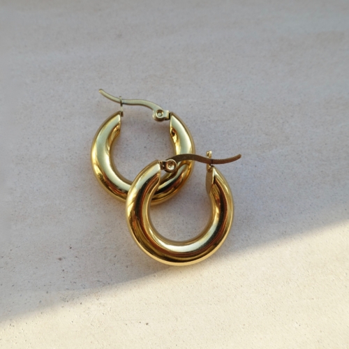Chunky gold hoops earrings, a timeless classic. These gold hoops can be worn with absolutely anything and they are an elegant way to dress up effortlessly. The hoops are thick yet comfortable to wear every day. Size External hoop circumference: 2cm/0.8″. Hoop width: 5mm. Weight: 22g. Composition 18K gold layer over stainless steel base. Hypoallergenic, tarnish-free & waterproof jewellery. We found the perfect formula to create gold plated jewellery that is durable, doesn’t discolour and looks just as good as fine jewellery. We use PVD technique for the gold coating over a stainless steel base. Our pieces are coated in a thicker gold plating than the industry standard for anti-tarnish, waterproof and long lasting wear. Due to the hypoallergenic properties of the stainless steel, it is unlikely that the jewellery will cause an allergic reaction. Our pieces are nickel free. Shipping FREE UK Standard shipping. Option to upgrade to 24hs/48hs Tracked delivery at the checkout. Packaging All of our jewellery comes in a Briella card inside a large (15x10cm) and delicate white linen pouch, perfect for gifting. Wrapped in FSC® packages, responsibly and sustainably produced.