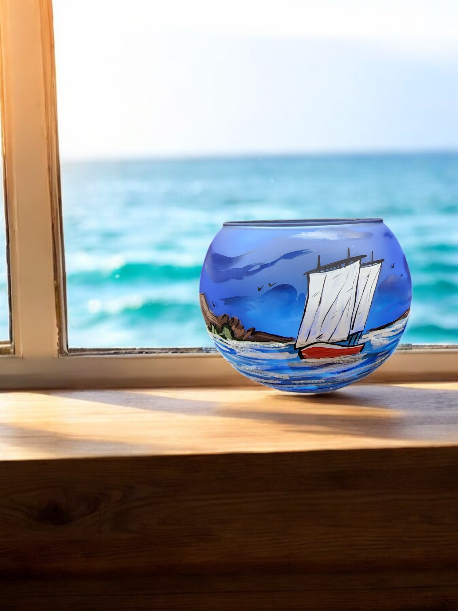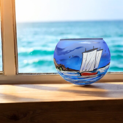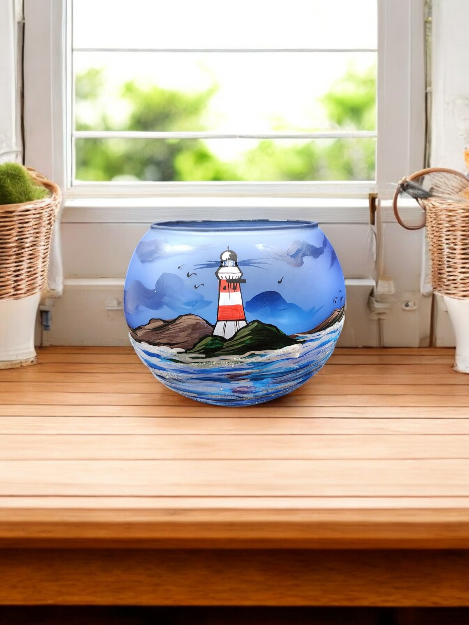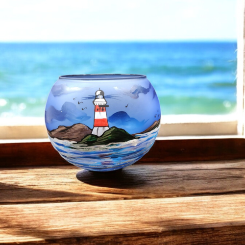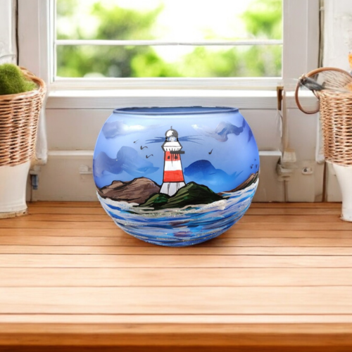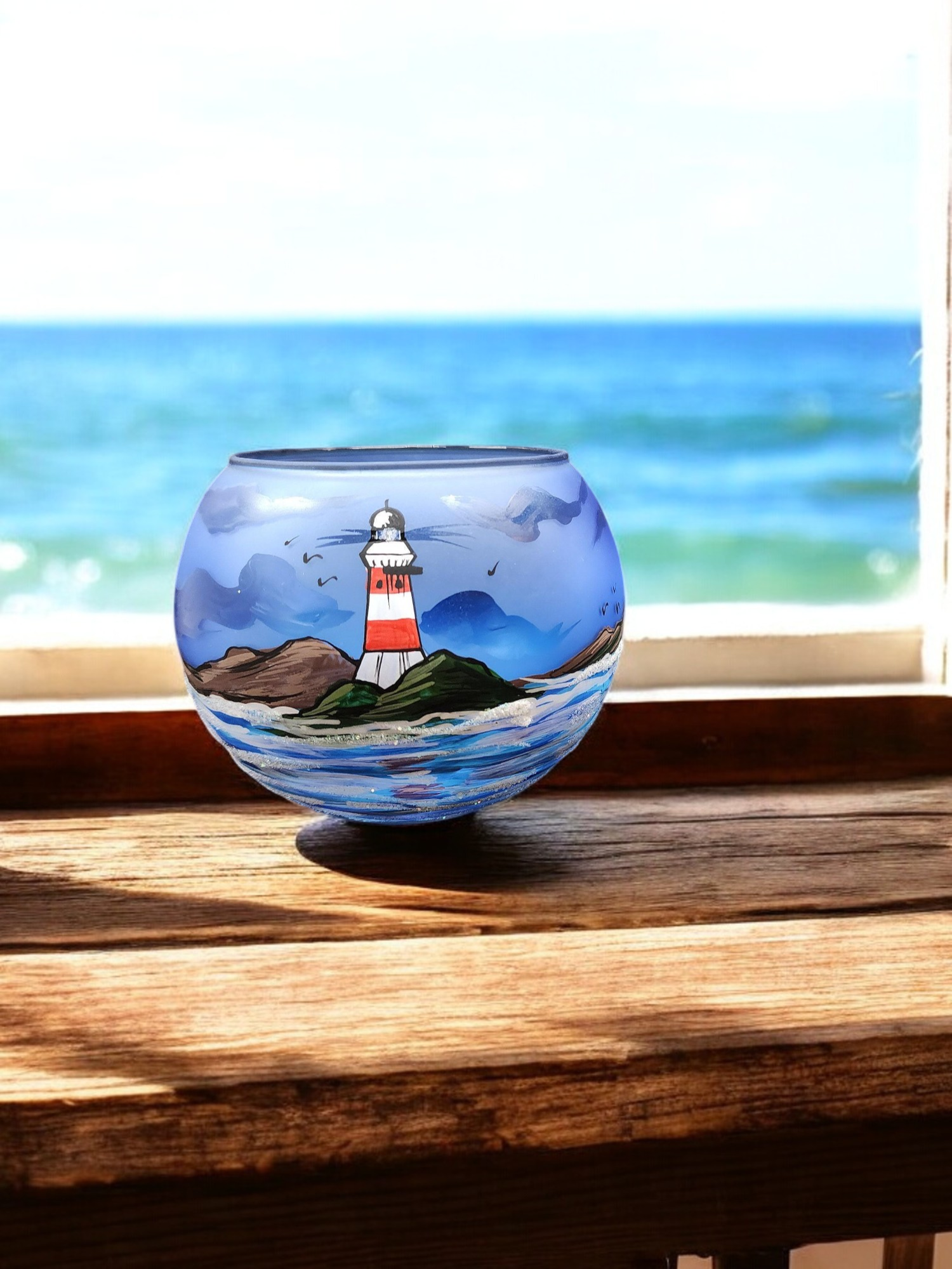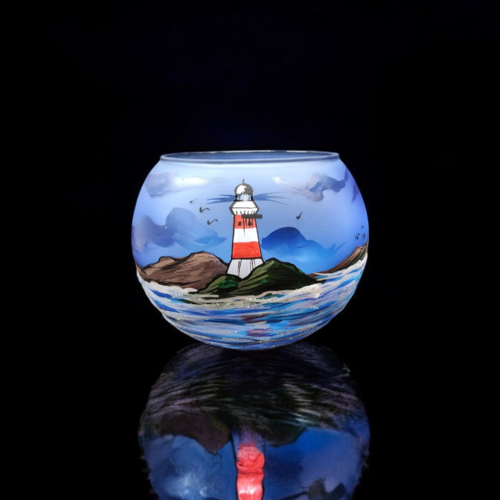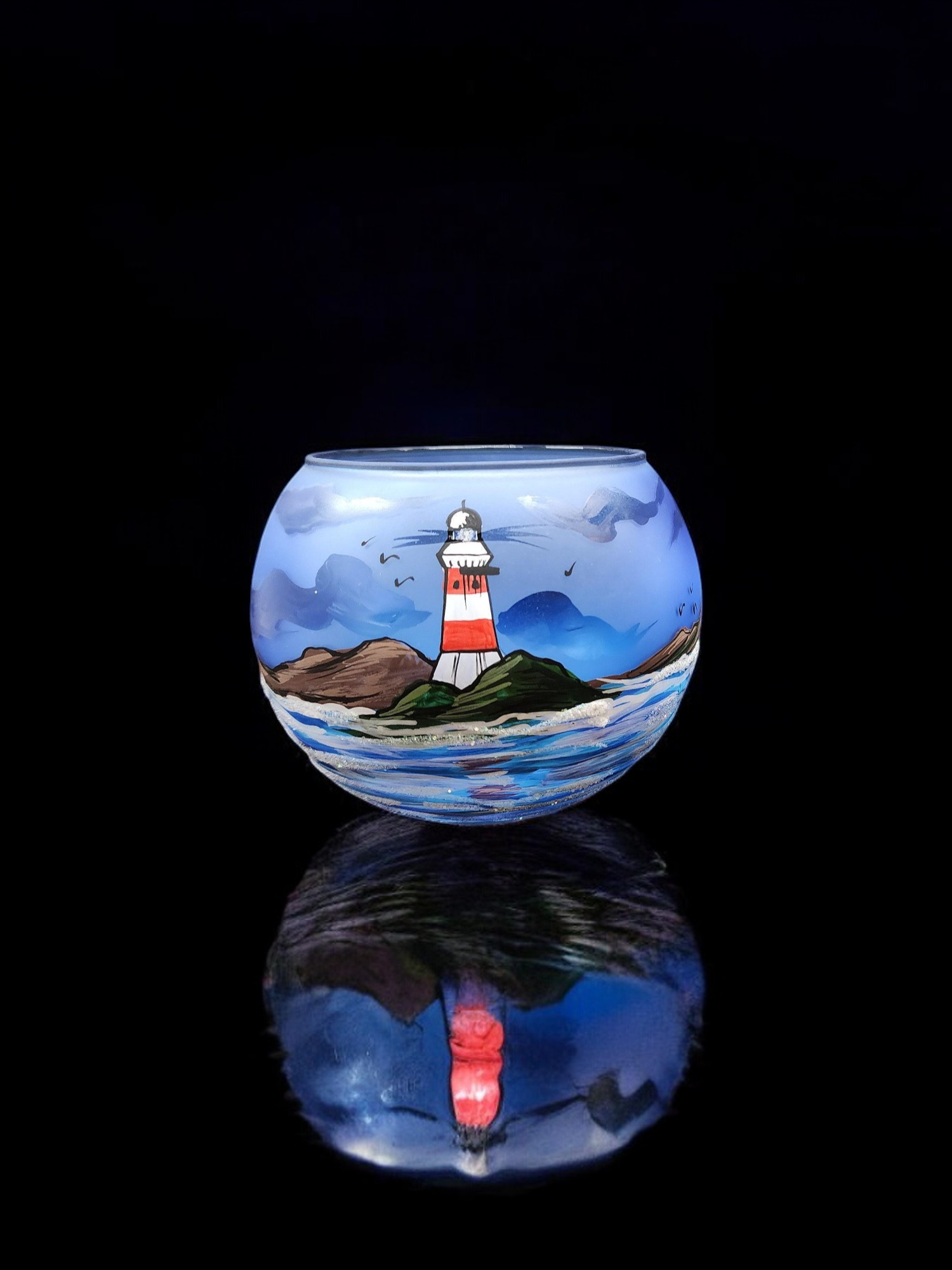 • Handcrafted In L’Viv Oblast, Ukraine• Mouth Blown Glass• Hand Painted – Stencil Free• Wraparound Design Means There’s Always Something To See• Individually Boxed (A Unique Piece Of Glass Art In Every Box)• Medium is approximately 3″ tall and 4″ wide• Ships From Greensburg, PA• 1 Day Order Processing• A Gift That Will Be Cherished Old world craftsmanship comes to life in these elegant, hand painted, Light House candle holders. These charming mouth blown glass candle holders featuring a light house are a great addition to any home. A beautiful design, the light house is set in a scenic mountain side ocean with a sailboat on the reverse side and choppy waters. A great gift for those that love the water, sailing, lighthouses or simply enjoy beautiful works of art. Each of our blown glass pieces is hand painted with skill, precision and love. While some prefer to use battery operated candles the best results are achieved using a real candle**. These candle holders are designed for tea lights, but depending on the size you get, can accommodate larger sizes as well. Medium is approximately 3″ tall and 4″ wide Made in Ukraine**Please note the candle holders are hand painted on the outside, so please do not allow them to get wet as water can damage the finish. To remove any wax we suggest a plastic butter-knife or a finger nail to scrape and a napkin or towel to wipe the inside.