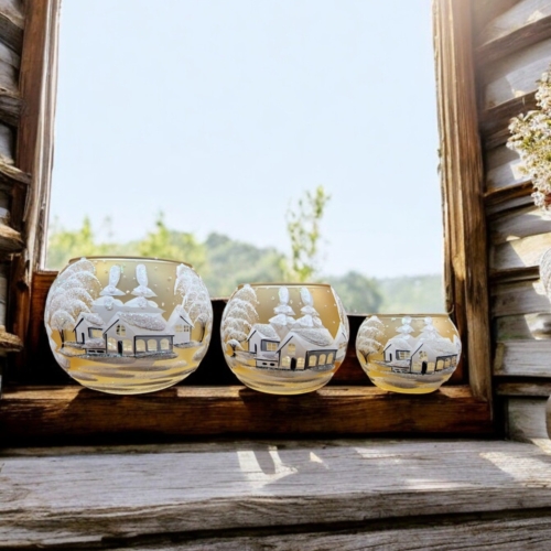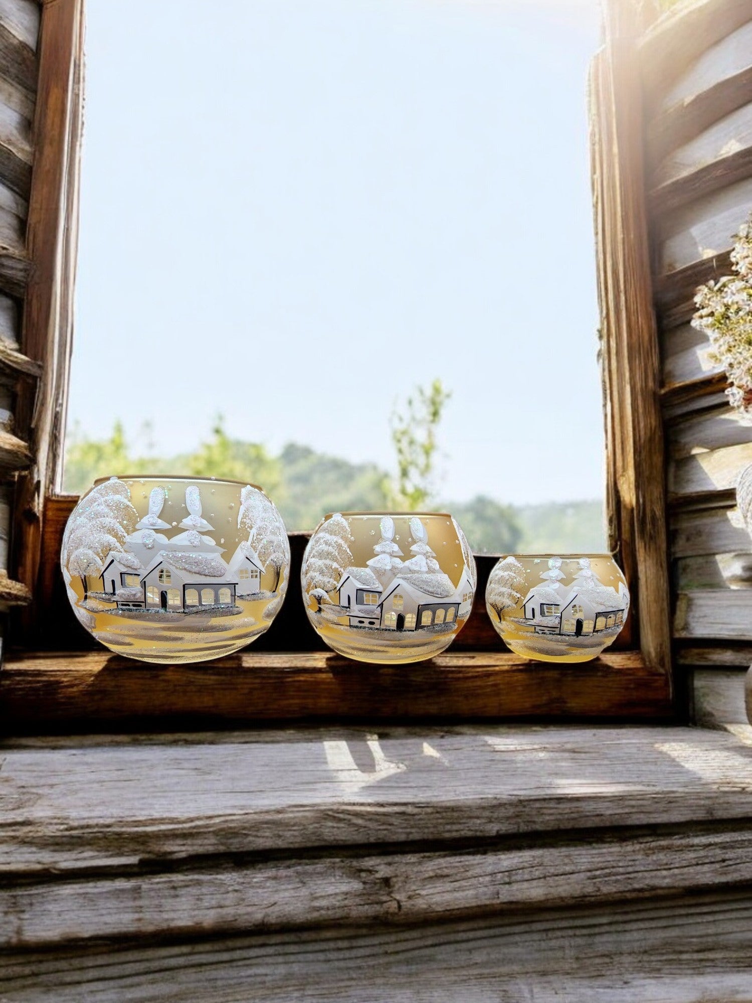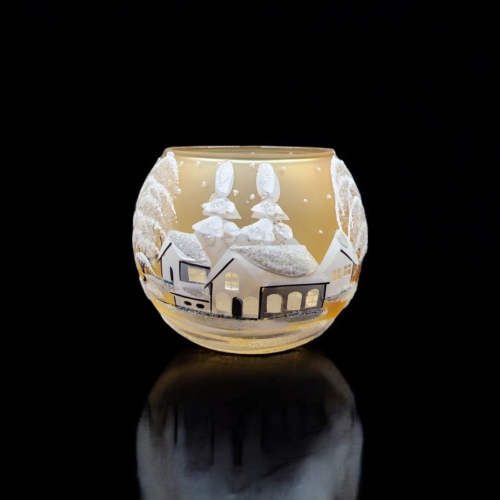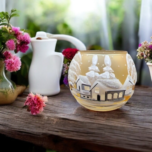 • Handcrafted In L’Viv Oblast, Ukraine• Mouth Blown Glass• Hand Painted – Stencil Free• Etched Out Windows Allow You To See Right Inside When The Candle Is Lit – Truly Beautiful• Wraparound Design Means There’s Always Something To See• Individually Boxed (A Unique Piece Of Glass Art In Every Box)• Medium is Approximately 3″ Tall and 4″ Wide• Ships From Greensburg, PA• 1 Day Order Processing• A Gift That Will Be CherishedBrighten your space with the enchanting glow of our hand-painted blown glass candle holders. Featuring a intricate White Cabins design, each piece is a testament to exquisite Ukrainian craftsmanship. Perfectly sized for tea lights, this unique holder adds a touch of elegance and artistry to any room. Whether you’re seeking a centerpiece for a cozy evening or a thoughtful gift, this candle holder brings warmth and beauty to your home decor. This candle holder can accommodate 1 tea light. Each piece is hand painted and we take great pride in our attention to details. Makes a wonderful gift, especially for those looking for something unique! Each of our blown glass pieces is hand painted with skill, precision and love. While some prefer to use battery operated candles the best results are achieved using a real candle**. These candle holders are designed to accommodate tea lights. Large about 4″ tall and 4.5″ wideMedium about 3″ tall and 4″ wideSmall about 2″ tall and 2.5″ wide **Please note the candle holders are hand painted on the outside, so please do not allow them to get wet as water can damage the finish. To remove any wax we suggest a plastic butter-knife or a finger nail to scrape and a napkin or towel to wipe the inside. Please be gentle. Perfect for Christmas, Easter, New Years, Birthdays, Anniversaries, Graduations, Valentine’s Day, Mothers Day, or celebrate a House Warming. Embrace the artistry of glass candle holder, a timeless handcrafted gift. Please allow for slight variances as each piece is unique, just like you. Note: The listed price is for a single candle holder Made In Ukraine