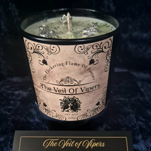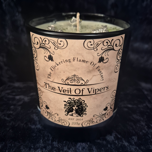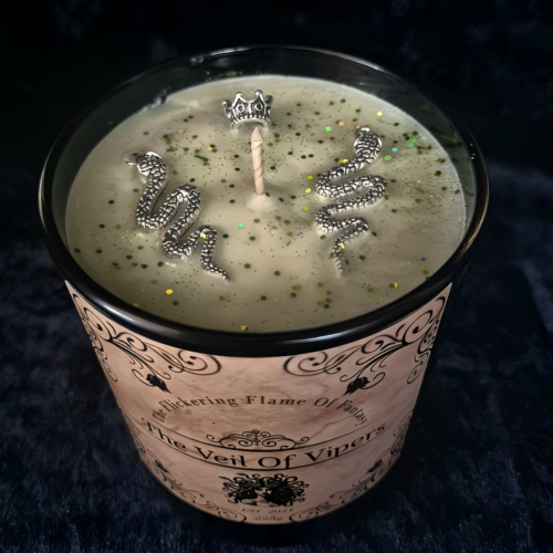 🐍 Veil of Vipers | Story Card Included “They called her a monster.She became a myth.” Beneath every curse lies a truth.Beneath every legend, a woman rewritten by fear. Veil of Vipers is an ode to Medusa—not as a villain, but as a goddess wronged and reborn. This candle captures her duality: breathtaking beauty and deadly stillness, soft strength and serpentine power. A flame for those who find grace in shadow, and elegance in defiance. The top of the candle is crowned with symbolic serpent charms, glimmering crystals, and eco-friendly glitter—a reflection of her hidden might and sacred glamour. A story card is included, revealing the tale they never dared to tell. ✨ Fragrance – Divine Reclamation Opening: Soft florals & fresh citrus, like the breath before a warning Heart: Rare gardenia, blooming where no one dares look Base: A delicate, musky finish, like a whispered threat wrapped in silk This is the scent of silent power, of beauty that demands reverence—not approval. Feminine, fierce, and unforgettable. 🕯️ Includes: 30cl Luxury hand-poured candle Crystal and charm adorned top with a gilded shimmer Illustrated story card retelling her rise, not her ruin A flame that burns as a reminder: she never needed saving Light it with intention.And let them meet your gaze.