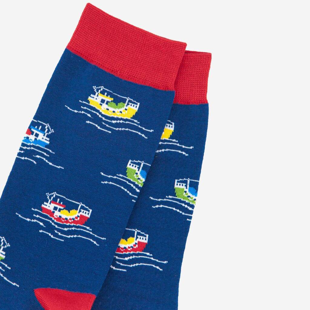 Men’s nautical themed bamboo socks with a repeating fishing boat design throughout. Men’s Fisherman’s Boat Print Bamboo Socks Anti-Bacterial & Anti-Fungal Soft & Breathable Eco-Friendly 70% Bamboo, 27% Polyester, 3% Elastane UK 7-11 | EU 40.5-46 | US 8-12 Machine Washable (Delicate)