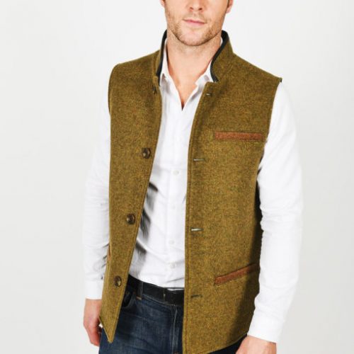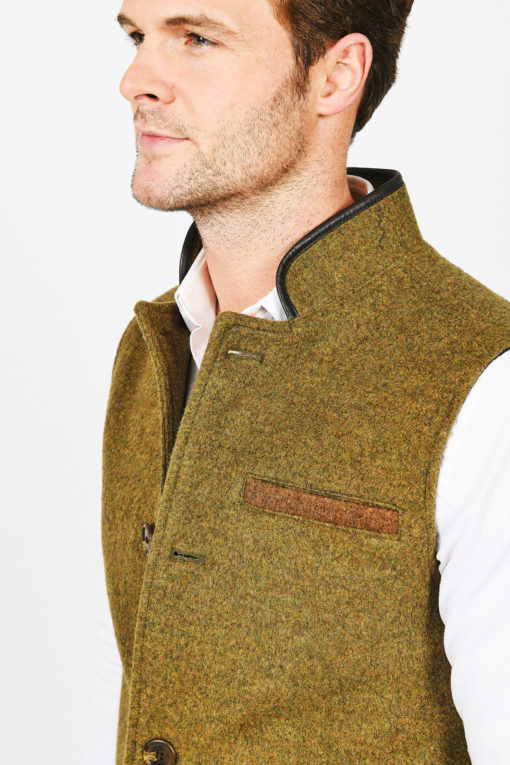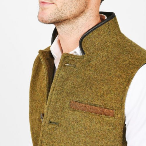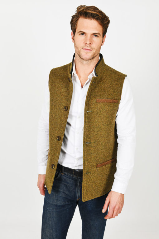 Warm, soft and yet hardwearing, our merino wool gilet in pastoral Moss Green with contrasting brown pocket detailing feels as comfortable as it looks. Wearable over a shirt or a jumper, or even under a coat, think of it as a loyal companion for all but the warmest of weather conditions. Features include British leather collar trim, 100% cotton lining and an inner top pocket.