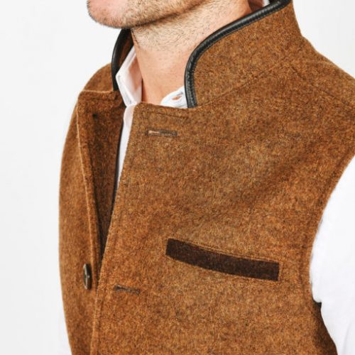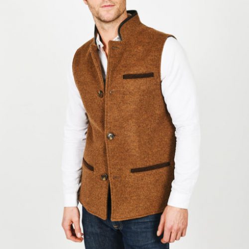 Our lighter Mouse Brown merino wool gilet features subtly contrasting darker brown welted pockets which makes for a relaxed, countrified colour combination. It comes complete with genuine British leather collar trim, navy cotton lining and an inner top pocket.