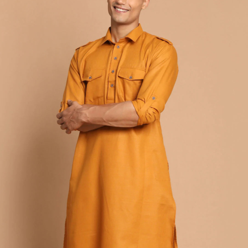 Kurta Color: Mustard|| Bottom Color: Off White Kurta Fabric: Cotton|| Bottom Fabric: Cotton Kurta Neck: Mandarian CollarTRUEKurta Work: Solid|| Bottom Work: Solid Type: Men Kurta With Pant Product Size: Kurta’s actual chest measurement is 6 inches more i.e. for 4 Sizes we give: M (38), L (40), XL(42), XXL (44) actual product chest will be M – 44,L – 46 XL – 48 XXL – 50 inches respectively Packaging Content: 1 Kurta & 1 Bottom Closure Type: Pull On Front Button Loop Wash Care: First Wash Dry Clean Recommended, Then Normal Machine Wash At Home. Fit Type: Regular/Comfort, Kurta Length: Knee Length Kurta Suitable For: Party Wear And Indian Traditional Occasions, Wedding Celebration Ethnic Clothing. Great As A Gift For Men: Everyone Uses Partywear On Numerous Occasions, Give This Kurta Pyjama Set As A Thoughtful Gift For Your Loved One’s Next Birthday, Anniversary, Wedding Or Any Occasion. This Is Why It Makes The Perfect Present For Your Dad, Husband, Son, Or Friend. Please Note: We Strive To Make Our Colours As Accurate As Possible; However, Due To Individual Monitor Settings, We Cannot Guarantee That The Color You See On Your Screen Is The Exact Color Of The Product. HIGH QUALITY MATERIAL: Lightweight And Breathable Material Gives This Kurta Pajama Set Soft, Comfortable Feel. Made From Cotton Fabric. The Kurta Is Lightweight With Vented Side. Designs Feature Modern And Innovative Details That Appeal To Everyone. Made in INDIA