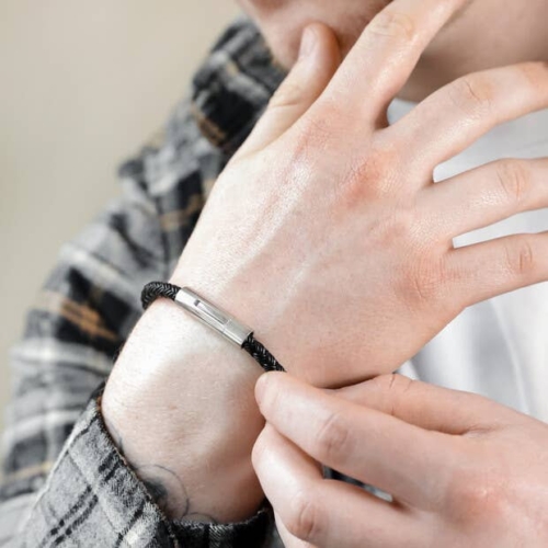 This stylish bracelet features strands of black leather woven together to create a textured jewellery piece. This classic bracelet will never go out of style and is a must-have for masculine accessorising. With a polished stainless steel clasp for easy wearing, simply press the button, slide on the wrist and reattach for a simple and timeless accessory.DimensionsIf you are measuring the wrist to get the correct size, please use the ‘inner circumference’ measurement.If you are measuring one of your existing bracelets, please use the ‘length’ measurement.inner circumference: large – 21cmlength: large – 22cmstrap thickness – 6mmtube clasp length – 2cm