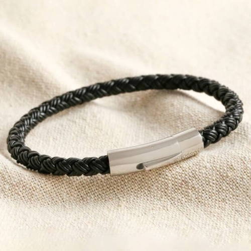 This stylish bracelet features strands of black leather woven together to create a textured jewellery piece. This classic bracelet will never go out of style and is a must-have for masculine accessorising. With a polished stainless steel clasp for easy wearing, simply press the button, slide on the wrist and reattach for a simple and timeless accessory.DimensionsIf you are measuring the wrist to get the correct size, please use the ‘inner circumference’ measurement.If you are measuring one of your existing bracelets, please use the ‘length’ measurement.inner circumference: large – 21cmlength: large – 22cmstrap thickness – 6mmtube clasp length – 2cm