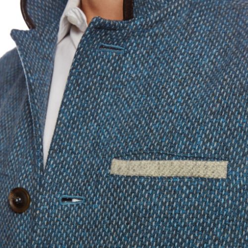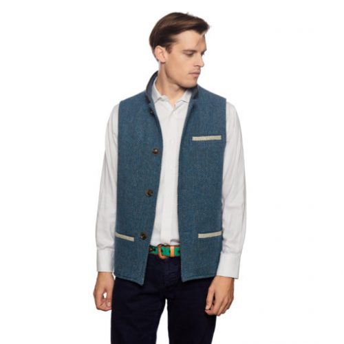 Our men’s gilet in ocean blue has been cleanly tailored from a beautiful 100% mid-weight Shetland tweed that has been lined with a lightweight and soft British fleece. The Somerset cowhide binding of the statement Nehru collar complements to four horn buttons of the closure, and the contrasting pebble grey pockets really stand out against the blue tweed. The gilet also features an inner pocket, concealed within the lining.