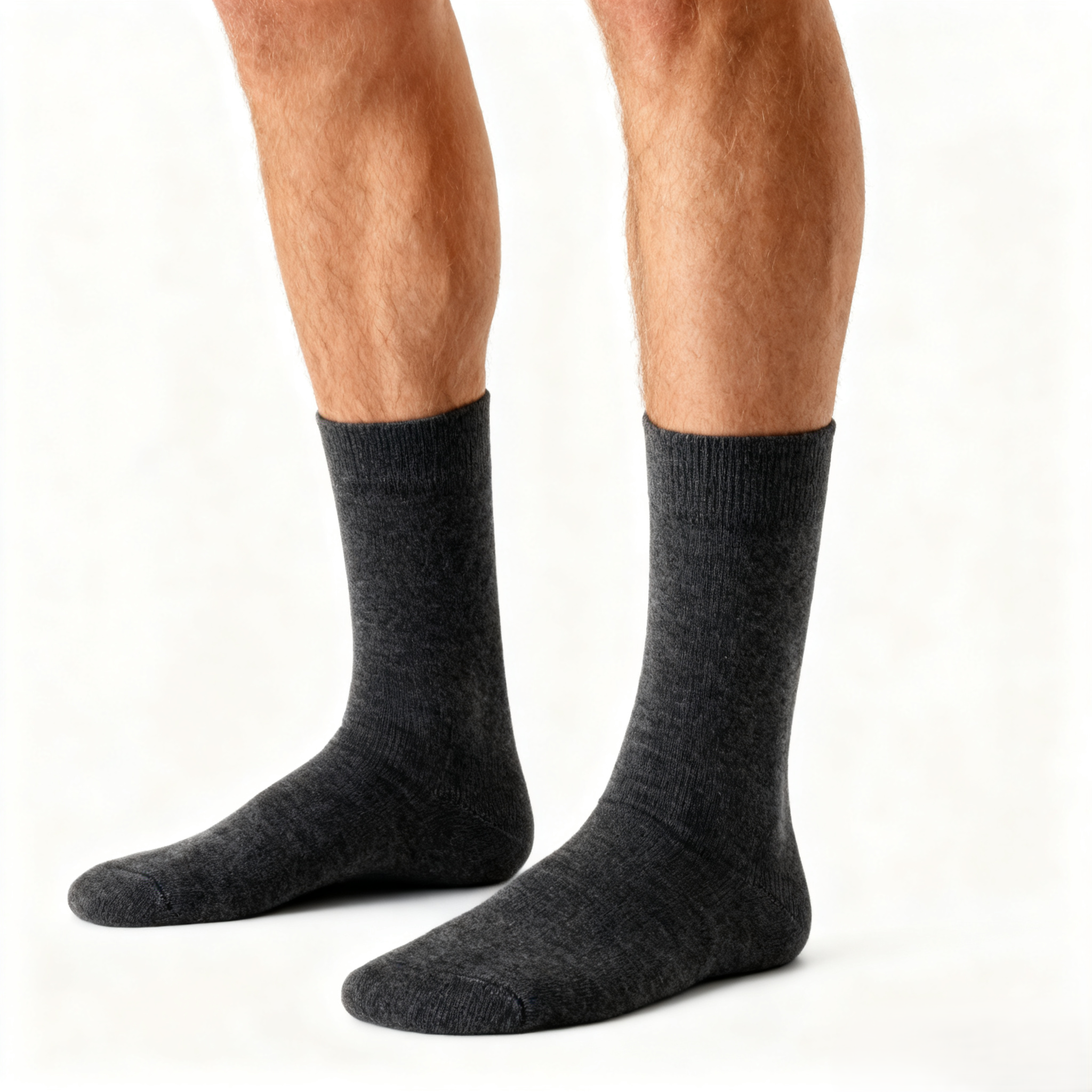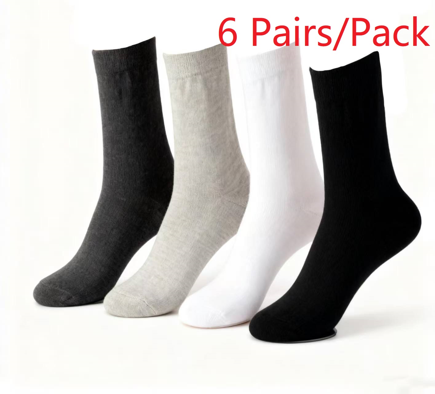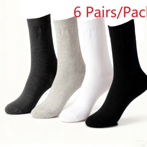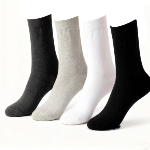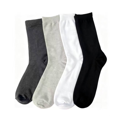 Product HighlightsClassic Crew-Length Design4 versatile solid shades (dark gray, light khaki, white, black) in crew length — fits comfortably above the ankle, pairing seamlessly with sneakers, boots, or dress shoes for work, daily commutes, or leisure. Comfort & Durability MaterialMade of 75% Polyester + 20% Covered Yarn + 5% Elastic (21S/1 +2075 specification): Soft, smooth against the skin, and stretchy; the fabric resists pilling and maintains shape after repeated washes. Snug & Flexible FitElastic ribbed cuff ensures the socks stay in place without binding; compatible with most men’s shoe sizes All-Season WearabilityLightweight yet moderately warm, suitable for spring, summer, autumn, and mild winter; machine-washable (cold water) for hassle-free care.