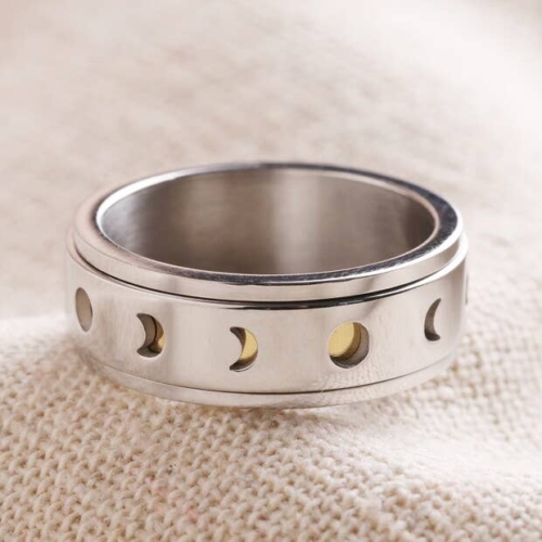 Chunky in size, this modern ring features a single stainless steel band of polished silver metal. The centre of the ring is accented by a quirky spinning centre, perfect for spinning between fingers when anxious, fidgety, or bored! This feature holds moon phase cut-outs with gold details shining through. DimensionsS/M – UK ring size SL/XL – UK ring size Wring thickness – 0.8cmMade fromstainless steel