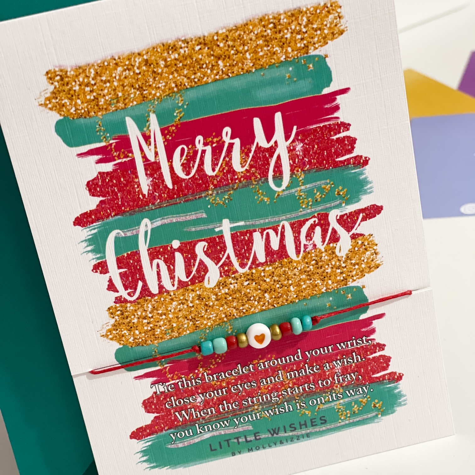 Little Wishes cords are 35mm in length and untied, so they will fit any size of wrist. Simply remove the cord from the card and tie to secure in place, then cut off the ends. They are presented on an A6 card on 350gsm luxury linen textured card in a clear cellophane pouch and each come with a matching envelope.