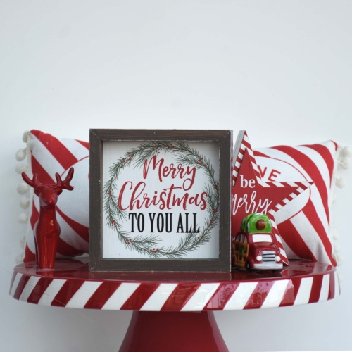 “Give the season a cheery salutation when you display this small Merry Christmas to You All Wood Tabletop Decor!