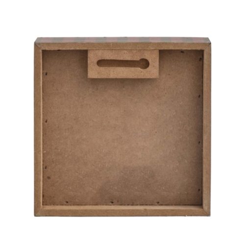 It is made from wood and sits easily on a shelf, mantel, table, or counter. The overall size measures 5.875 x 5.875 inches.