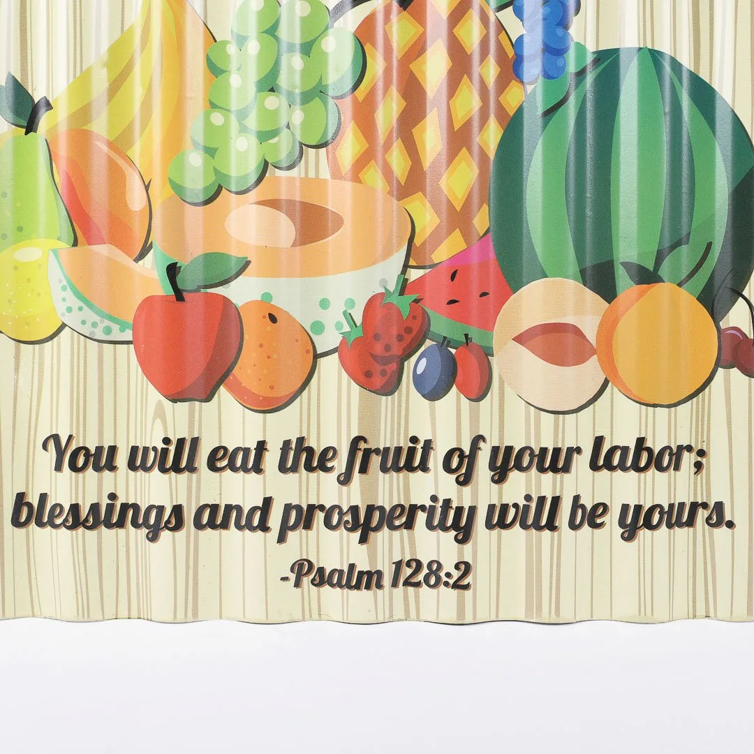 The bold black lettering stands out against the textured metal background. Vibrant fruit illustrations add a pop of color and represent the rewards of labor and faithfulness. Together, they create a beautiful balance of style and meaning.