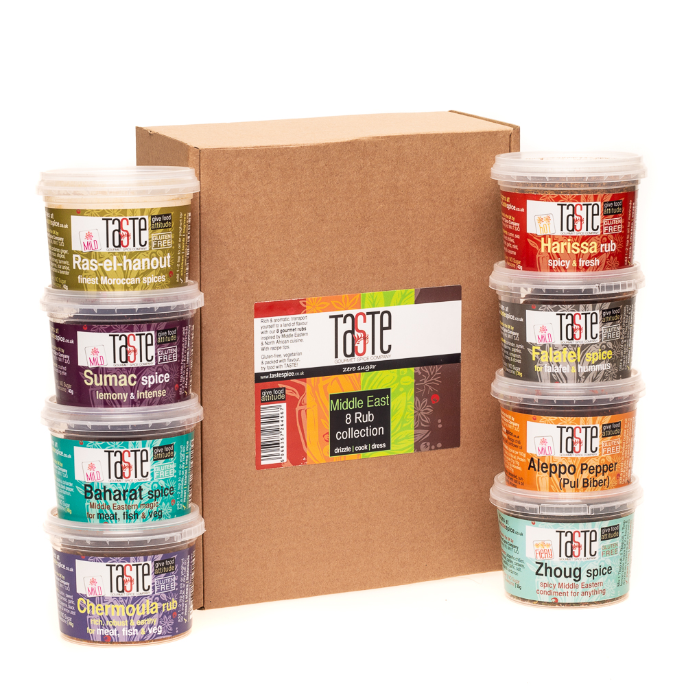 Our ‘Middle East’ 8 Rub Collection is the ideal way to transport your senses to the far away lands, full of heady spice & rich aromas. As well as using some of these blends to make a gorgeous feast, it includes everyday favourites like pul biber, Sumac & Harissa. We use something out of this box either every day or every other day to keep mealtimes interesting.