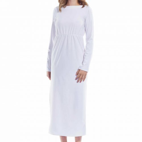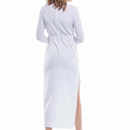 Loose cut midi length dress made of fine crepe fabric with a deep neckline on the side. Raised ruffled waist ensures a casual look that can be stylishly combined with both high heels and sneakers.