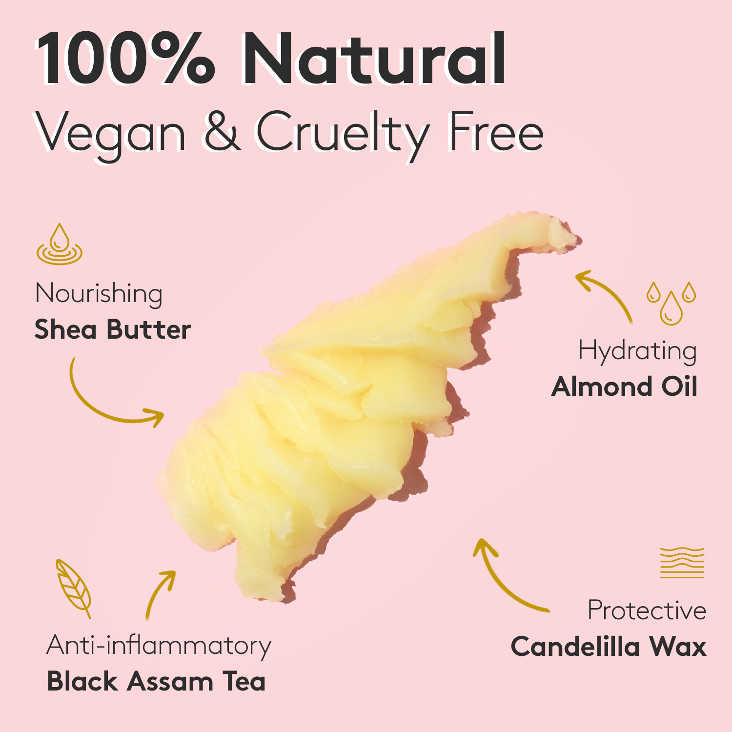 Thirs-tea skin? This balm delivers instant intense moisture and long-term relief for dry, dehydrated skin. Fast-absorbing, deeply nourishing and can be used on the face as well as the body. Caffeine from our signature Indian Black Assam tea contains anti-inflammatory properties to reduce redness and soothe skin from within. Easy to apply (thanks to an eco-friendly push up tube) and melts into your skin leaving you buttery soft and smooth all over after just one use.
