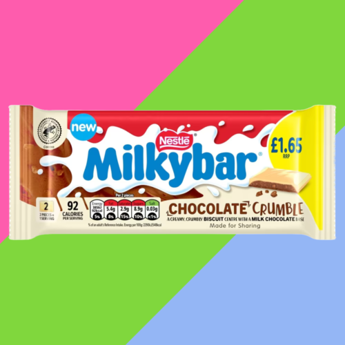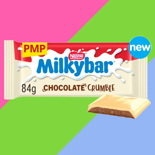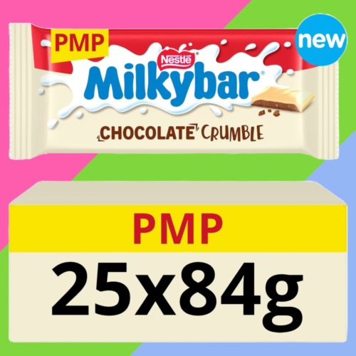 Vanilla flavoured filling with biscuit pieces on a milk chocolate base covered in white coating Made for sharing with family or friends No artificial colours, flavours of preservatives £1.65 price-marked bars NEW Milkybar® Chocolate Crumble White Chocolate sharing bar 84g. A creamy, crumbly vanilla flavoured biscuit centre with a milk chocolate base, all covered in a white coating.At Milkybar® we love to keep it simple, nothing but great, creamy tasting smooth white chocolate. From bars to blocks to Giant buttons, its the same delicious taste that you and your family know and love! Pure and Simple, no artificial nasties – just the unmistakable taste of Milkybar’s white chocolate. No wonder we are the nations favourite white chocolate brand!