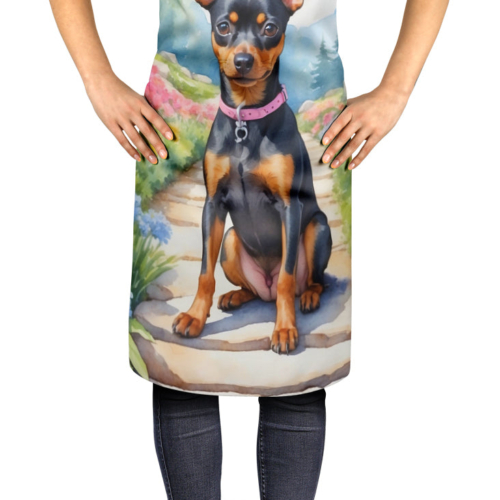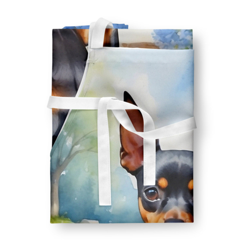 Apron featuring breed specific Miniature Pinscher artwork. Elevate your cooking, baking, and grilling experiences with our versatile Kitchen or BBQ Apron. This Bib Style apron isn’t just limited to culinary activities – it also serves as an excellent baking apron, artist apron, server apron, gardening apron, or even a dog grooming apron. The apron showcases vibrant full-color artwork contributed by one of our talented artists, bringing a dash of style to your daily tasks. With dimensions of approximately 27″W x 30″H, it provides ample coverage to protect your clothing from spills and splashes. Our apron is meticulously crafted from 100% Ultra Spun Polyester, known for its durability and lightweight nature. The apron comes with white tie straps, ensuring a comfortable and adjustable fit for all. It’s a perfect choice for kitchen apron enthusiasts, whether you are a woman or a man. Designed for easy maintenance, this apron is fully machine washable. The quick-drying polyester material actively reduces staining, keeping your apron looking fresh and new for longer. Our beautifully designed apron isn’t just a functional kitchen accessory – it’s a fashion statement in the culinary world!