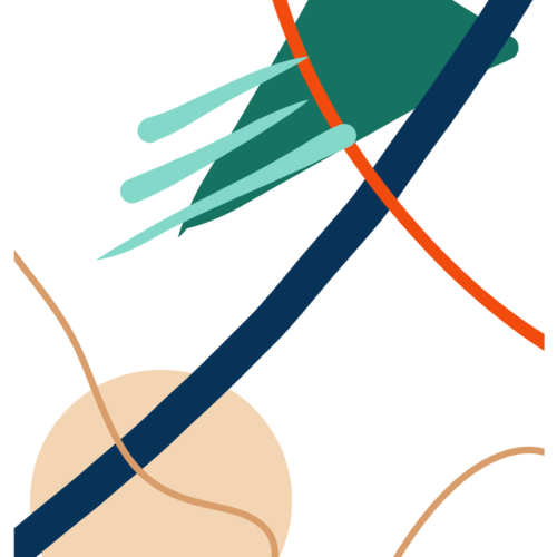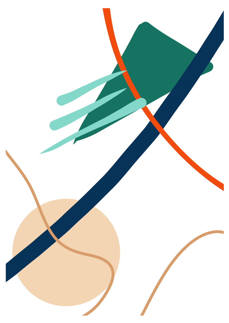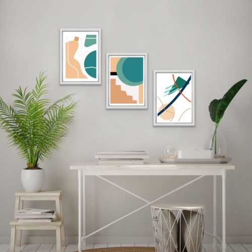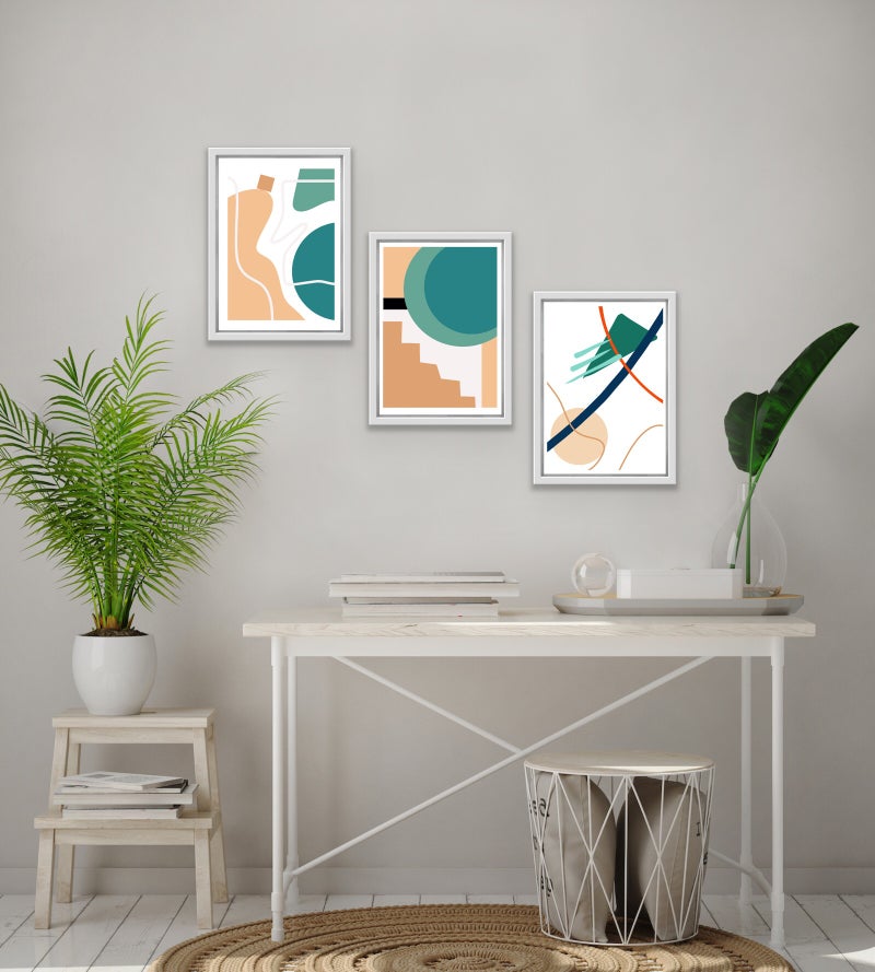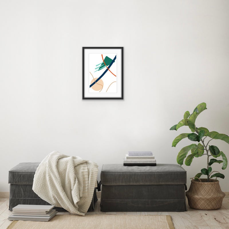 A stylish and simple print for any room of the house. A combination of lines and shapes in sand, blue green and red.