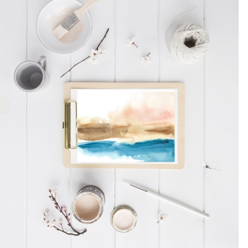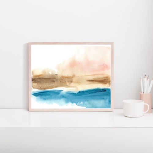 This is a stylish abstract art print which is available unframed in two sizes. A modern fine art giclée print inspired by the scenic coast and sea of Ireland. The original painting was hand painted in acrylics. The painting was then scanned and printed professionally on archival fine art paper to ensure a vivid and richly coloured print that will last a lifetime. The print is made up of stunning rich blue, soft brown with a pink sky.
