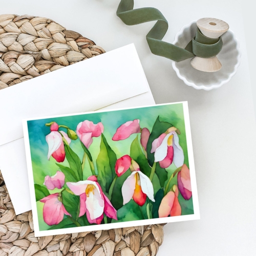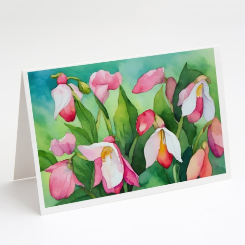 Greeting Cards Pack of 8 featuring breed specific Minnesota Pink and White Lady�s Slippers artwork. Celebrate special moments with Caroline’s Treasures Printed Greeting Card Pack. This pack includes eight beautifully folded 5×7 cards, accompanied by eight matching white envelopes. With blank interiors, these cards provide ample space for your personalized messages and heartfelt holiday greetings. Each card features captivating full-color artwork, meticulously printed in our facility on high-quality 80 lb cover stock or 216 GSM. The super smooth finish of the white cards enhances the visual impact of the artwork, creating a truly stunning presentation. Designed by our talented in-house artists or licensed artists, the artwork on these cards showcases their creativity and attention to detail. From vibrant illustrations to captivating designs, each card tells its own unique story. Whether it’s for birthdays, anniversaries, holidays, or any special occasion, Caroline’s Treasures Greeting Card Pack is the perfect way to convey your heartfelt sentiments. Share joy, love, and warm wishes with these exquisite cards and make every moment unforgettable.