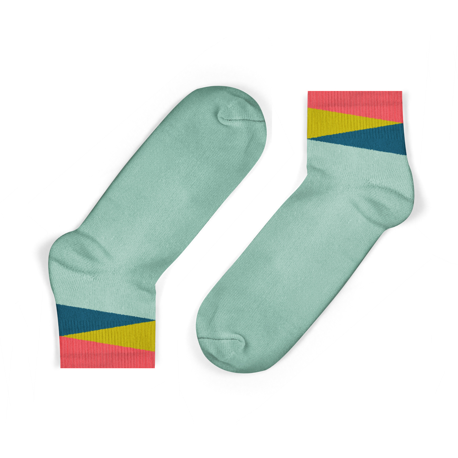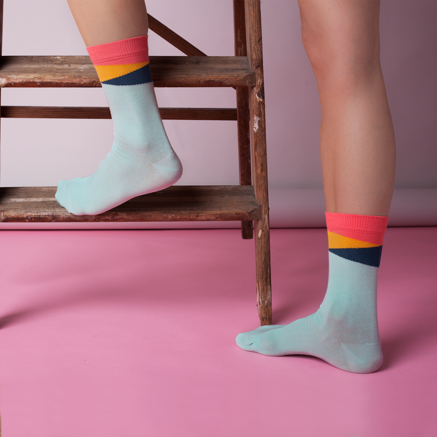 Made in Portugal from soft organic cotton these beautiful fresh mint socks feature a bright ribbed cuff with a combination of coral, mustard and legion blue colours. The hardest thing about our geom socks is choosing which colour combination to wear.
