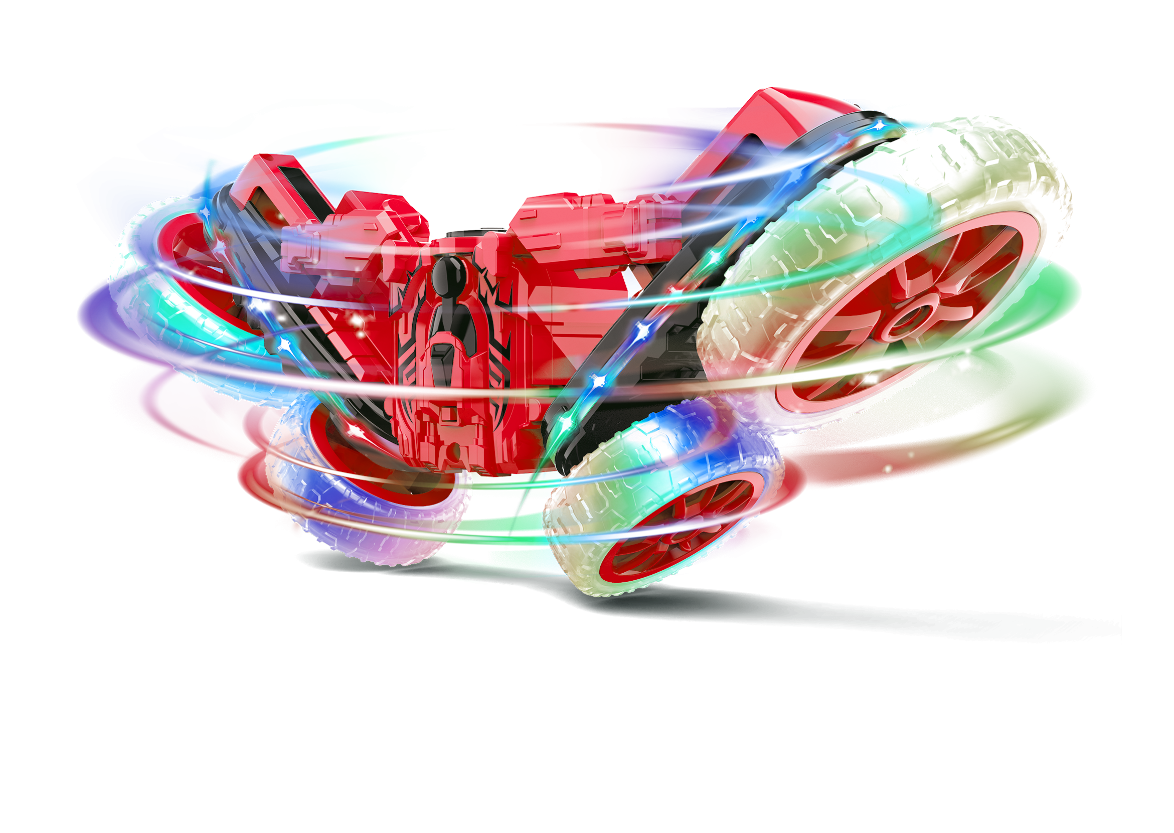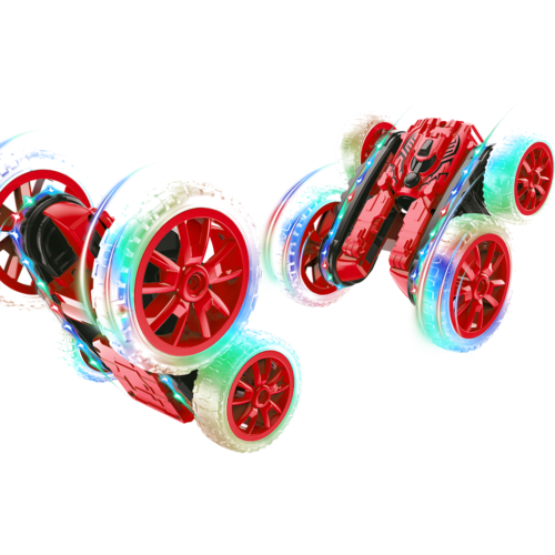 The Mist Master is a space age vehicle that puts a new spin on RC stunt driving. Each 4-wheel vehicle functions like a normal vehicle, but splits and spins at the push of the remote control. While spinning, the Mist Master can emit fog and light from its exhaust and can execute exciting 180° flips and 360° spins with ease.
