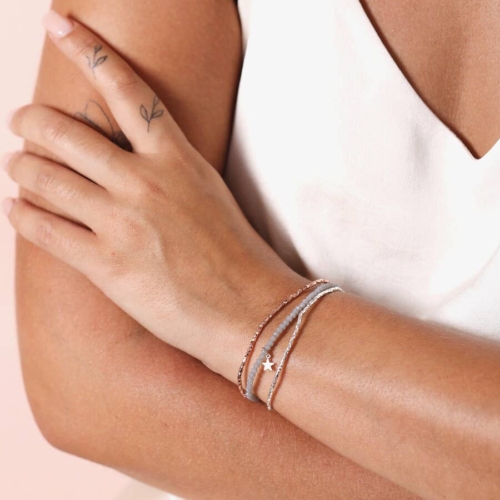 A stunning triple-colour, triple-layered stacked braceletIn rose gold, silver and grey; a diverse and textured colour palettePerfect for layering alongside other sparkly silver or rose jewelleryDimensions: elasticated inner circumference – 6cmMade from: jewellery elastic, glass, brass