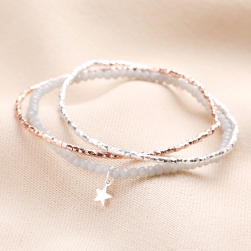 A stunning triple-colour, triple-layered stacked braceletIn rose gold, silver and grey; a diverse and textured colour palettePerfect for layering alongside other sparkly silver or rose jewelleryDimensions: elasticated inner circumference – 6cmMade from: jewellery elastic, glass, brass
