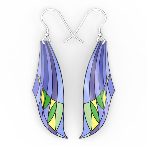 Wonderfully colourful earrings, inspired by the leaves of a tree against blue sky. The gently curved design catches the sun from most angles, with glints from the underlying brushed aluminium.