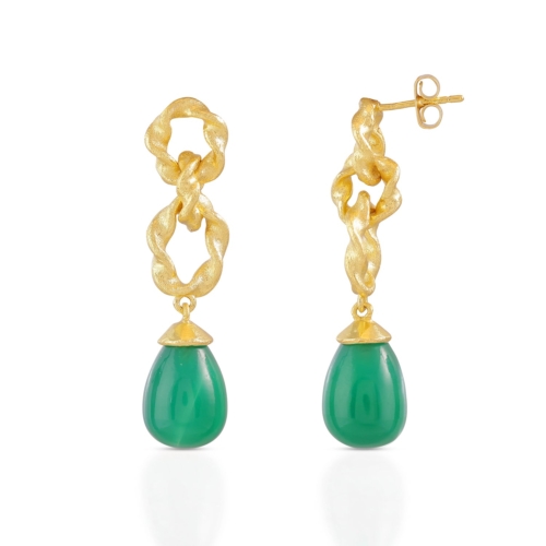 Artisan handcrafted Metal: 22 Karat Gold on recycled Brass Gemstone: Green Onyx Earring dimensions: Total length 40mm All jewellery arrives in our luxury soft pouch and box Inspired by the Moirai, the three sisters of fate. These earrings trace the delicate threads that draw us to serendipitous moments — a quiet homage to the invisible weave of destiny.