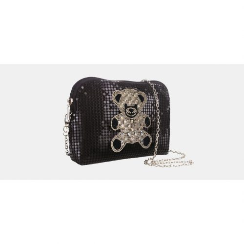 Handmade in Italy this cute pochette in a soft black metallic mesh material is decorated with Moliabal’s loveable crystal teddy bear. Teamed with skinny jeans or a cocktail dress this is perfect as a fun evening bag with the chain shoulder strap attached. It also makes a very stylish cosmetics or accessories bag.
