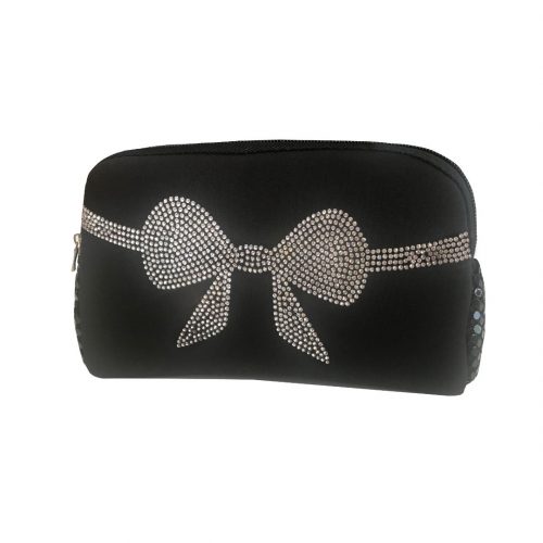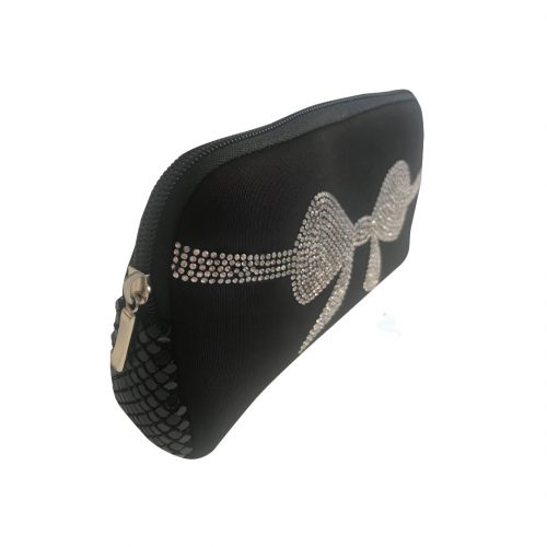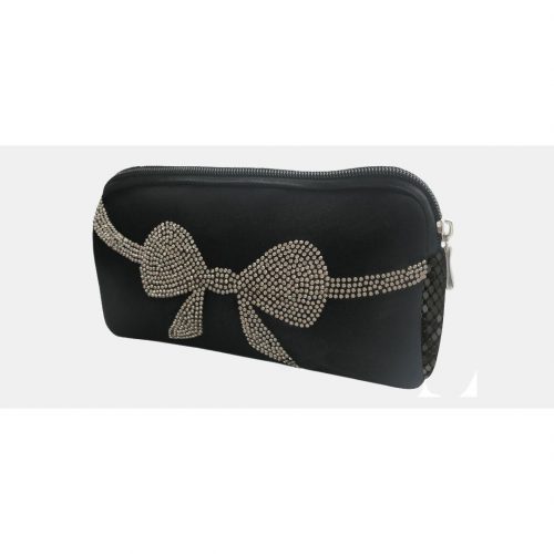 Handmade in Italy, this cute and sophisticated pochette is crafted in black neoprene with soft black metallic mesh sides. It features a large bow design in sparkling crystals. Perfect as a fun evening bag with the chain strap attached, or a stylish cosmetics r accessories bag.