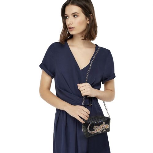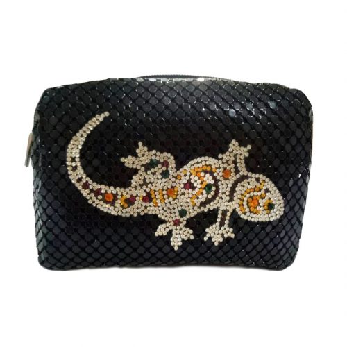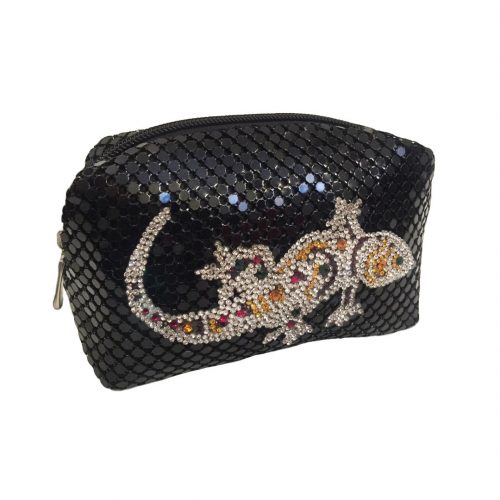 Handmade in Italy this cute pochette in a soft black metallic mesh material is decorated with a colourful crystal Geko. Perfect for accessories or as a stylish cosmetics bag. Comes with a wrist length chain strap that attaches to one side.