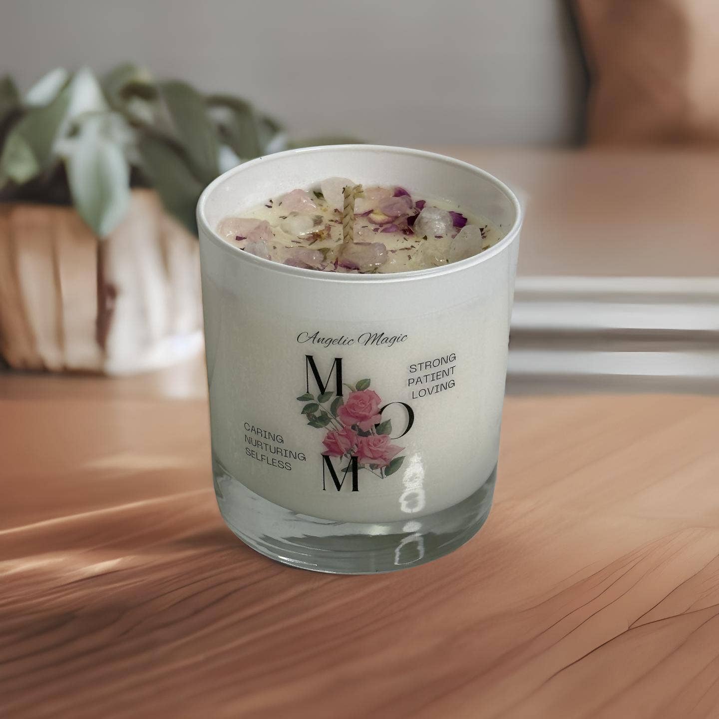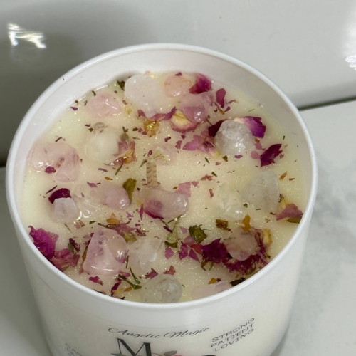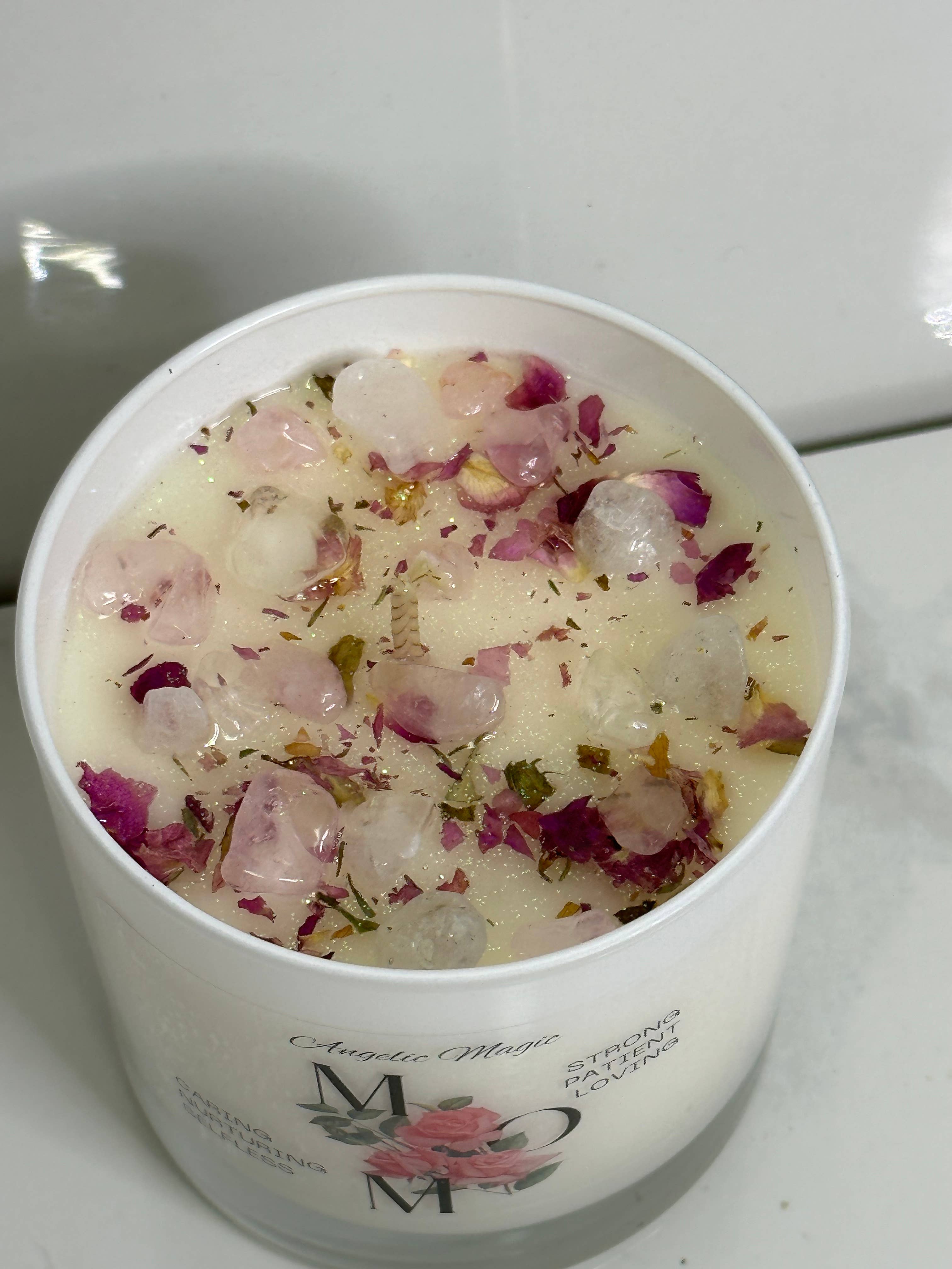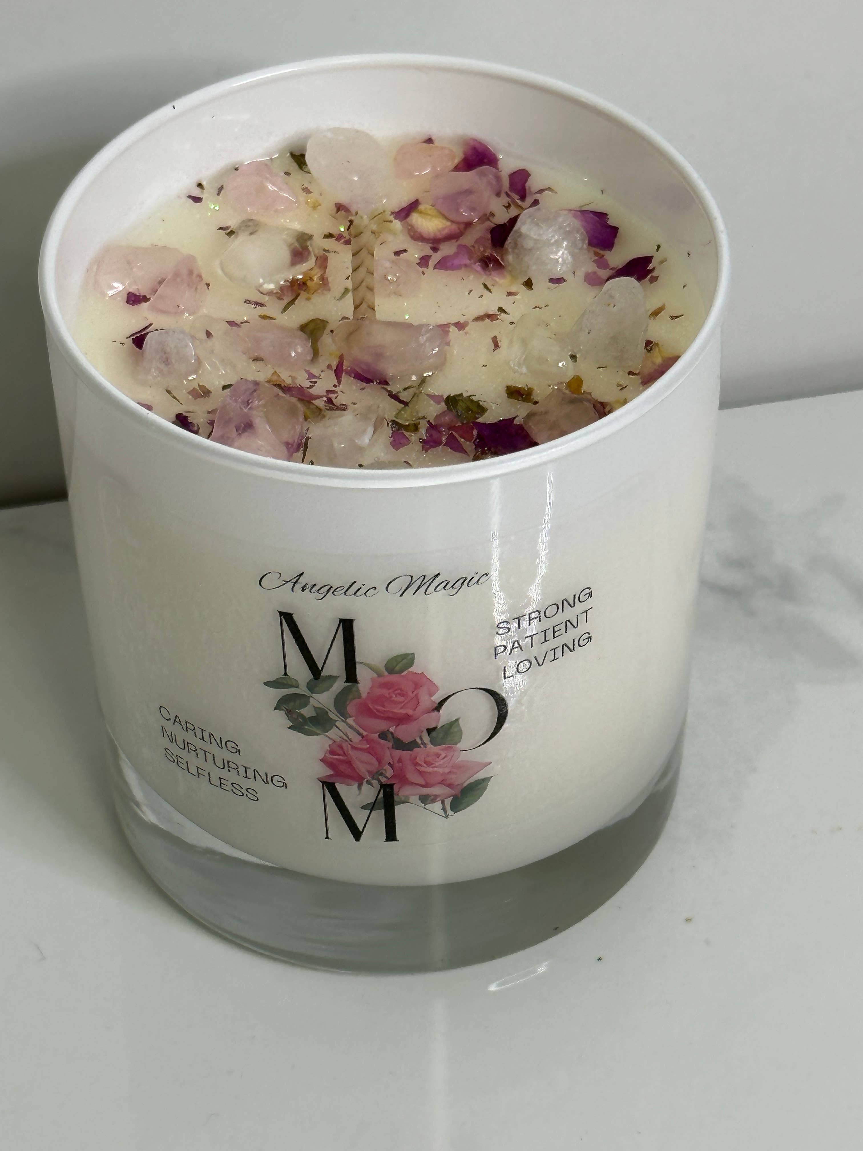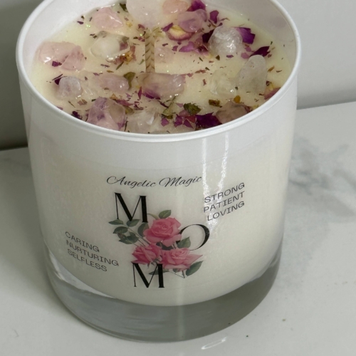 Introducing our limited edition Mother’s Day candle, designed to give your mom a memorable and luxurious experience. This candle is handcrafted with the finest ingredients and infused with the goodness of rose quartz crystals, white quartz, and a delightful ginger spice scent.The delicate aroma of ginger spice fills the air as soon as you light the candle, creating a warm and inviting atmosphere. The sweet and spicy fragrance is perfect for relaxing and unwinding after a long day. The subtle scent is soothing and uplifting, making it an ideal gift for the most important woman in your life.Rose quartz crystals and white quartz are added to the candle wax, providing healing properties that help to promote love, self-care, and positivity. Rose quartz is a symbol of love and harmony, while white quartz is known to bring clarity and balance. Together, they create a calming and serene environment that a mom will appreciate.