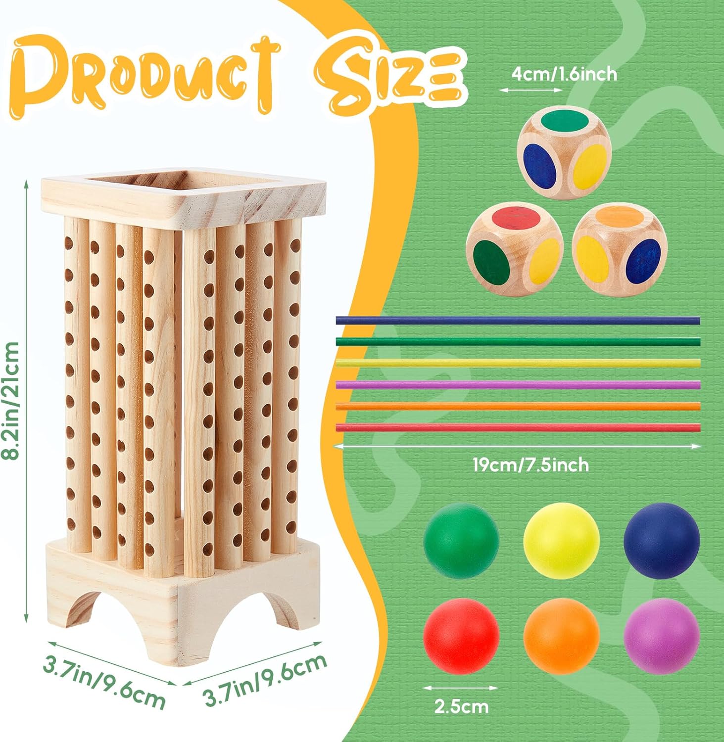 Math Educational Toys for Skill Improvement: our wooden board games help you ones develop their perceptual abilities and promotes brain development; It introduces them to basic math concepts and logical reasoning, thereby serving as ideal math educational toys; The package includes 1 tower, 42 colorful sticks, 6 balls, 1 dice, providing complete tools for learning and funEngaging Montessori Game: this designed Montessori game ensure to engage you in a delightful session of playing and learning, blending fun with education; The game accommodates up to 6 players, fostering dynamic game playing, suitable for family gatherings and picnicsDurable and Safe Material: crafted with attention to detail, the wooden math games are made of quality beech wood, ; The vibrant color, safe paint, and the surface without burr ensure the complete safety and enjoyment of your little ones; With the size of about 8.27 x 3.78 x 3.78 inches/ 21 x 9.6 x 9.6 cm, it’s compact, portable, ideal for family gatherings, picnics, and more, an ideal option to play and learnEntertaining Wooden Sticks Dice Game: in this exciting wooden sticks dice game, players place a net of sticks over the tower and place the wooden balls on top, players alternate in the act of throwing dice and taking away sticks, their chief aim being to stop the balls from slipping through, The winner is the player who lets the least number of balls drop; The gameplay is designed to promote logical thinking and patience, enhancing perceptual and cognitive abilitiesIdeal Gift Idea: catering to the curiosity, this Montessori game is a funny and thoughtful gift for birthdays, holidays, or simply as a surprise, the nice blend of education and entertainment for you, creating memorable family bonding times