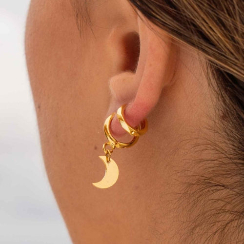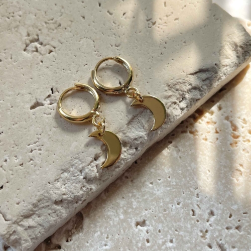 A delicate gold plated huggie holds a little crescent moon shaped drop charm that channels the celestial. Minimal, subtle and so easy to stack up. MATERIALS : 18k gold plated sterling silver SIZING : 12mm hoop, 7mm charm