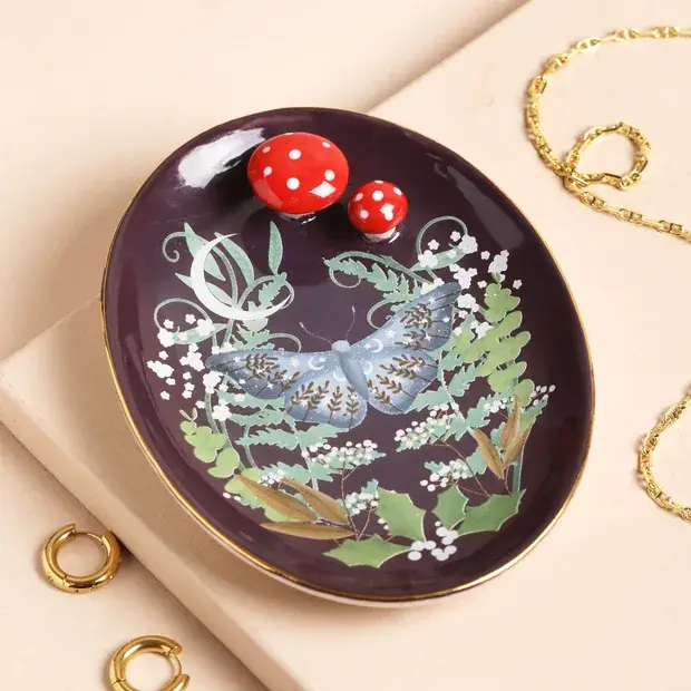 Made from ceramic, this enchanting bedside accessory features a cluster of 3D mushrooms at the top of the dish making it a unique addition to a bedroom. The perfect size for rings, earrings or other small treasures, this charming dish would make the perfect present for a friend or a teen who absolutely adores forest-inspired designs.Dimensionswidth 12cm x height 3cm x length 15cmMade fromceramic