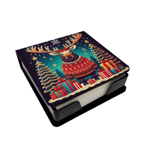 PU Leather Note Paper Holder featuring breed specific Moose artwork. Celebrate Christmas with this Christmas Note Paper Holder. Elevate your workspace with this PU Leather Note Paper Holder, crafted to resemble luxurious leather without the use of animal products. Made from durable synthetic PU leather, it offers both a premium look and eco-friendly appeal. This note holder, compactly sized at 4.25 x 4.25 x 1.25 inches, includes about 160 sheets of 3.75 x 3.75-inch note paper—ideal for quick notes and reminders. An exclusive artist-designed cover makes each holder uniquely vibrant, adding a splash of color and personality to any desk or office. The discrete design keeps note paper hidden, maintaining a neat and organized workspace. Perfect as a gift or for personal use, this stylish holder is refillable with standard paper, ensuring long-lasting utility. A must-have for anyone seeking a sophisticated, artful touch to their workspace while supporting animal-friendly products. Add style, organization, and creativity to your everyday routine with this elegant note paper holder.