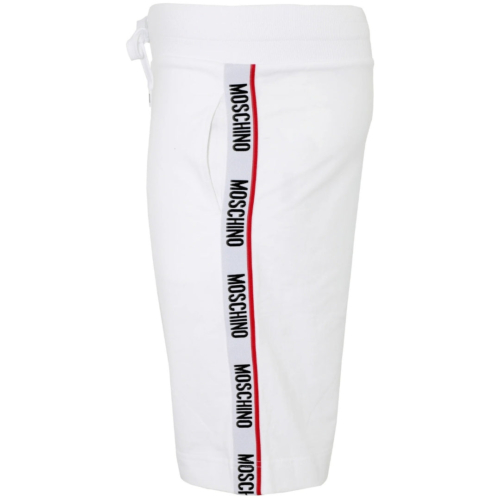 Moschino White Shorts, Tape Logo Down Legs, Elasticated Waist, Comfortable Stretch Fit, 95% Cotton, 5% Elastane, Back Pocket, Drawstring Ties, Moschino Loungewear, Taped Branding, Monotone Logo On Pocket