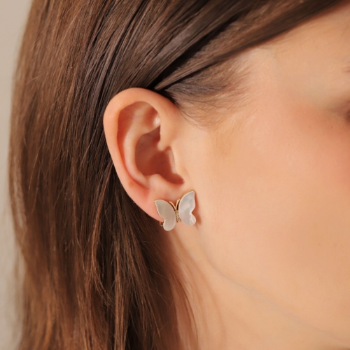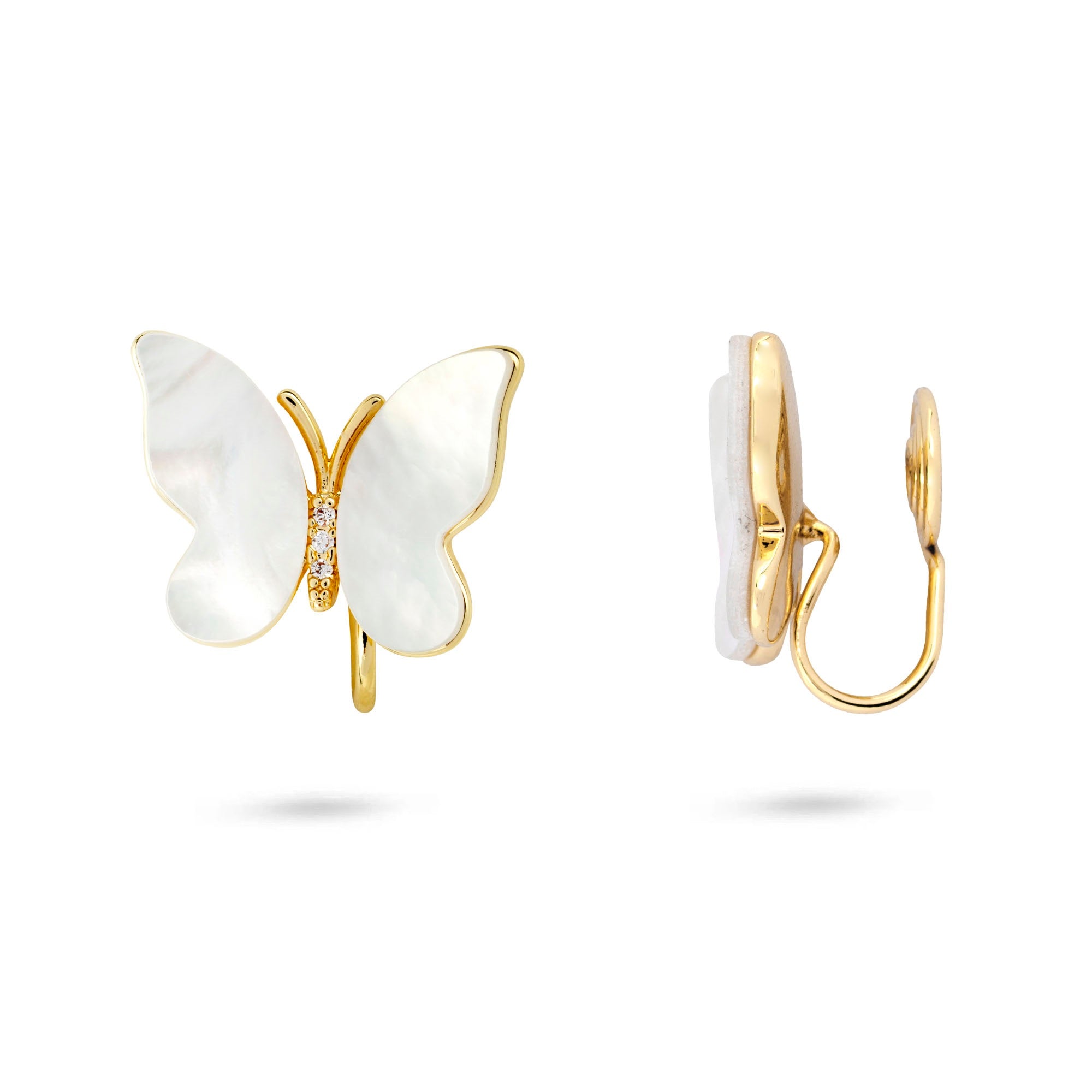 DESCRIPTIONExquisitely crafted Mother Of Pearl Butterfly Clip On Earrings featuring delicate butterfly silhouettes. Designed for people with and without piercings, these earrings simply clip under the lobe. Lightweight and comfortable, these earrings don’t pinch and can be worn all day. Supplied with optional silicone backs, they grip to the back of your lobe and you won’t notice you’re wearing them. Symbols of transformation, rebirth and hope, these Mother of Pearl Clip On Earrings are on trend and playful. SIZINGWidth at widest point 18mm, height of earring 19mm, earring thickness 2mm. GOOD TO KNOWOur new clip-on earring range is affordable and lightweight and is crafted from alloy metals, a brass base with either silver or gold plating. These earrings feature faux mother of pearl finishes to the butterfly wings. Each earring comes with a removable silicone cover for the back, providing extra grip and comfort. PACKAGINGDelivered in a Gold Trip presentation box, perfect for gifting yourself or others.