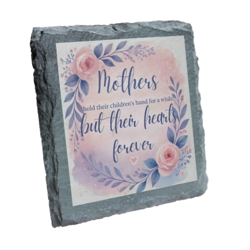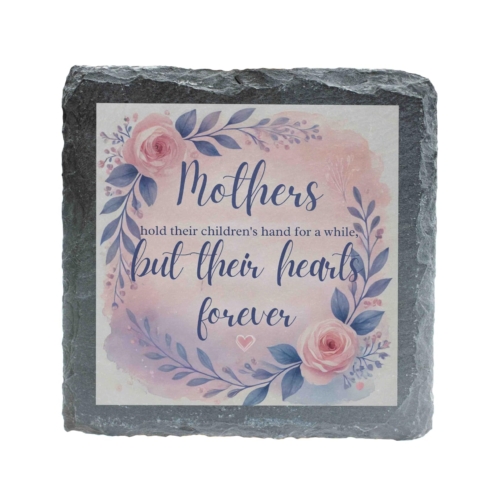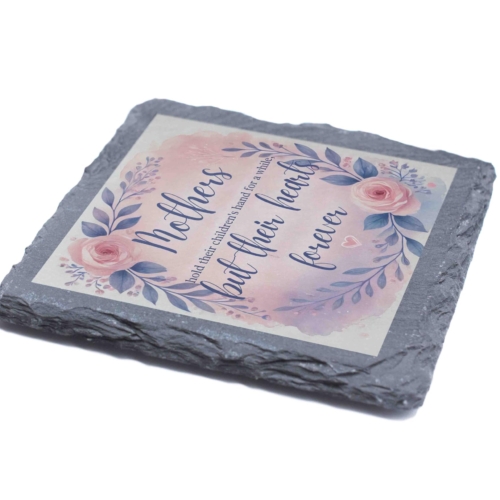 Show your mother how much she means to you with this beautiful slate coaster featuring the touching message, “Mothers Hold Their Children?s Hands for a While, But Their Hearts Forever.” The design is adorned with a soft floral wreath, adding a gentle and elegant aesthetic to any setting. Crafted from premium natural slate, this coaster is both functional and decorative, perfect for safeguarding tabletops or serving as a timeless keepsake. Whether as a gift for Mother?s Day or a meaningful token of appreciation, this coaster is a heartfelt way to celebrate the unconditional love and bond you share with your mom. Sentimental Design: Features a heartwarming message surrounded by a delicate floral wreath in soft pastel hues, perfect for celebrating the bond between mothers and children. Natural Slate Material: Made from high-quality natural slate, offering a rustic yet elegant touch to your tableware or decor. Multi-Functional Use: Ideal as a drink coaster or as a decorative keepsake to cherish forever. Perfect Gift for Mothers: A thoughtful and heartfelt present for Motherâs Day, birthdays, or any special occasion to show your love and appreciation. Durable and Eco-Friendly: Designed to protect surfaces while being crafted from sustainable, long-lasting materials.