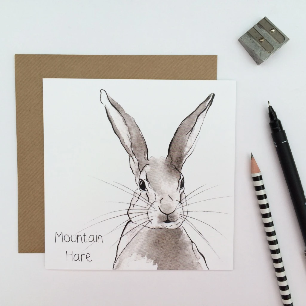 A contemporary watercolour illustration, featuring a wild mountain hare.