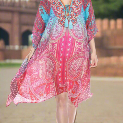 Kaftans work perfectly as beachwear Cover-Ups, carelessly-yet-carefully strewn over swimwear. Get knotty (read: naughty!) as the string of the bikini top peeps through the sensuous embroidered V-neck of the short kaftan. Check out the collection at La Moda. Sheer Cover Up Kaftan Style Beachwear, Resort Wear, Cruise 100% Viscose Silk V-Neckline, Mid-Thigh Animal Print / Multi-Color Size: One Size Washing Instruction: Dry Clean Material:100% Viscose SilkPack Details:4 pcs