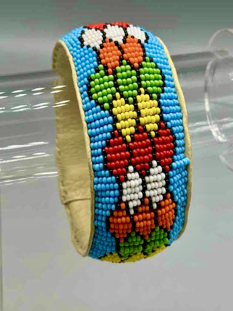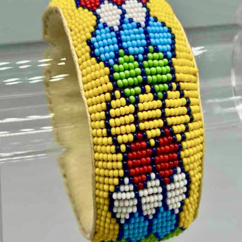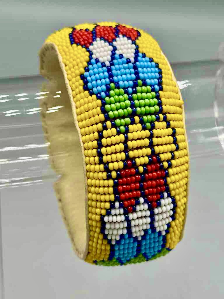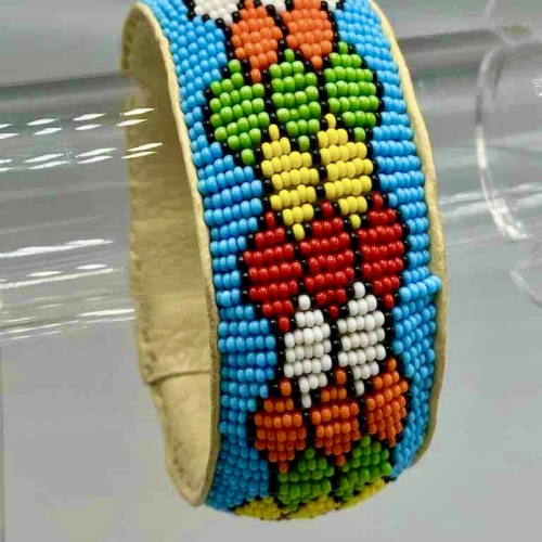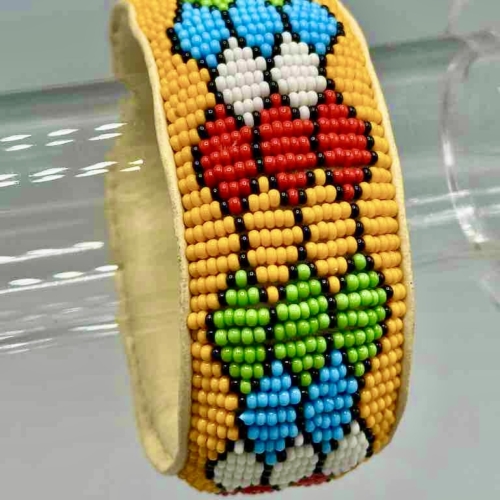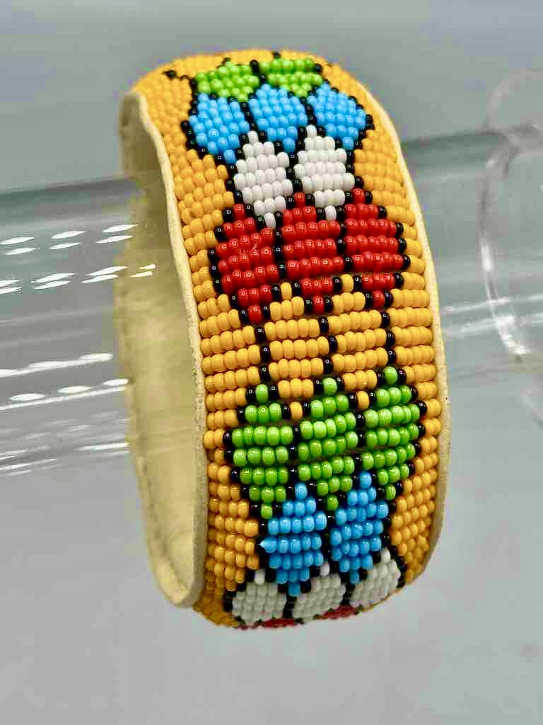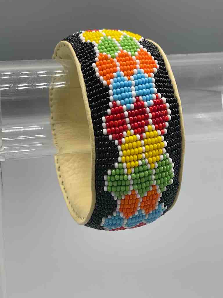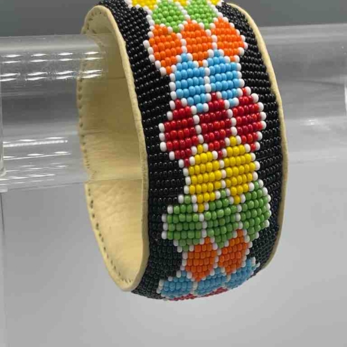 These are the widest beaded leather bracelets made in Mali, where they make a wide variety of this type of bracelet. These are available now in 7 different color/design versions, all beaded on natural interior goatskin leather. These beads are the normal seed beads used in most bracelets and other beaded items, not the smaller beads featured in some of our finer quality beaded leather bracelets. Please see the other versions of this same bracelet that we have, all with the same SKU prefix BBR-9X. 2 1/2″ interior diameter x 1 1/2″ wide (6 x 3.8 cm)