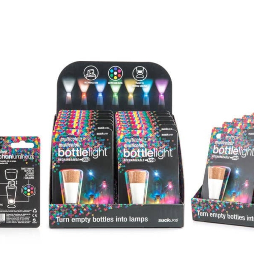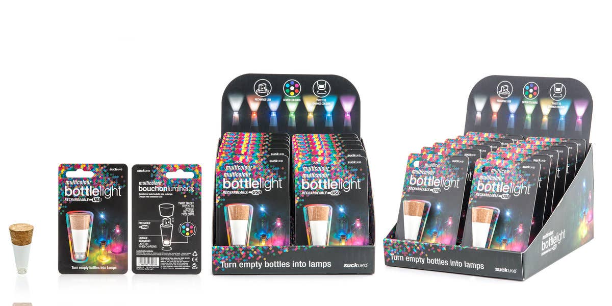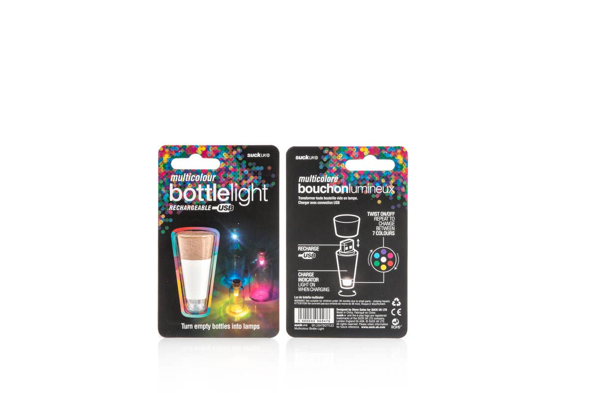 The original, high-quality cork shaped LED light that fits almost any bottle.Recharges via any USB outlet in one hour and gives light for three hours once fully charged.Simply twist the light section of the cork-shape to turn on the beautiful glowing light and enjoy!Makes a cute table decoration both in and outdoors, no plug sockets necessary!Dress your table for a wedding, dinner party, festival or carnival and watch your event glow with a warming light.Give classic Suck UK novelty gifts this Christmas and holiday season. We’ve got something for everyone – from kitsch kitchenware & charming Christmas decor to boo-tiful Halloween gifts sure to scare away boring home decor. Remember, once a Sucker always a Sucker.