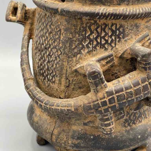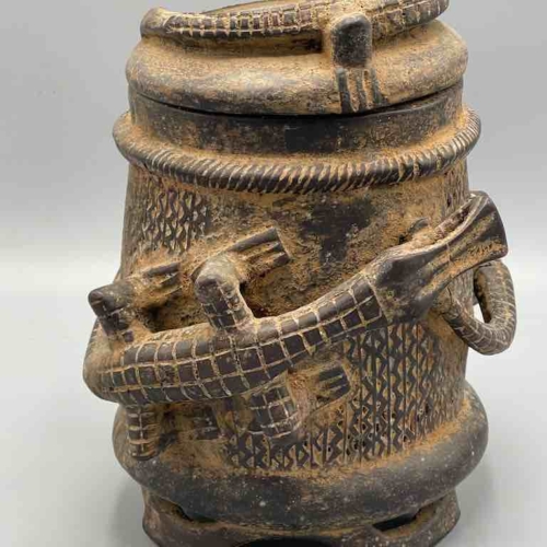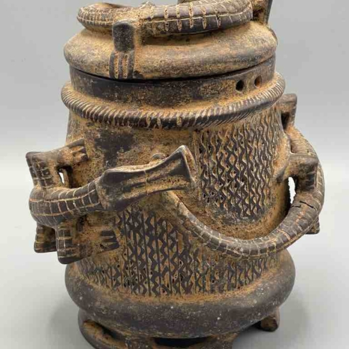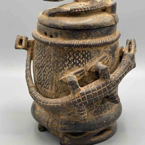 Many, if not all, African societies incorporate some means of divination into their daily lives. Most Africans believe it is not only possible and reasonable but indispensable to know the future impact of any decision taken in the present in order to determine its advisability. This is accomplished through many techniques; each tribe has its own. The Baule of Ivory Coast use the Gbekre, aka mouse oracle or mouse box, among other methodologies. Oral traditions among the people of the Baule region, including the Yaure and Guro, who may have initiated the practice of mouse divination, indicate that a long time ago mice could speak. As they commonly live in the ground in the forest surrounding the village mice are in close contact with the asye usu, the forest spirits, which see and know all and which, in turn, live closely to the ancestors. Divination experts, those with specialization in all spiritual matters, brought mice into the village to live in captivity. In many African societies animals are believed to have innate insight into the human experience. Specialists spend years in training: they learn to compensate the divinities and the oracle for the enlightenment it provides, to ensure that they will remain favorably disposed and they learn to prepare medications and to interpret a vocabulary of visual signs. There are several ways in which those signs may be generated. In all variations the mouse is placed in the lower chamber of the oracle. One variation is that corn kernels are placed in the upper chamber of the oracle and covered. A yes or no question is asked and if the mouse eats the corn in the time allotted, then the response to the question is affirmative. On the contrary the response is negative. In other variations, small sticks are placed in the upper chamber. The sticks are called gbekre nyma, “the eyes of the mice.” Bird or bat bones have also been used. Corn or other food may be placed among the sticks or the sticks may be coated with flour. The oracle is covered and the mouse eats the food though its movements create a new pattern of the sticks which constitutes the sign to be interpreted. Some of the known stick positions include: “open path, favorable augury,” “the consultant will receive a visit,” “sickness,” “death of a woman in the village,” “successful labor,” “unfavorable sign for a projected marriage,” and “death of an individual in another village.” This object was beautifully made for sale on the art market. Sometimes when wood is not completely dry when carved it can separate slightly in some places. The price of this beautiful sculpture represents this characteristic which is represented in the photos. This figure measures:10 1/4″ tall x 8″ diameter (26 x 20 cm)